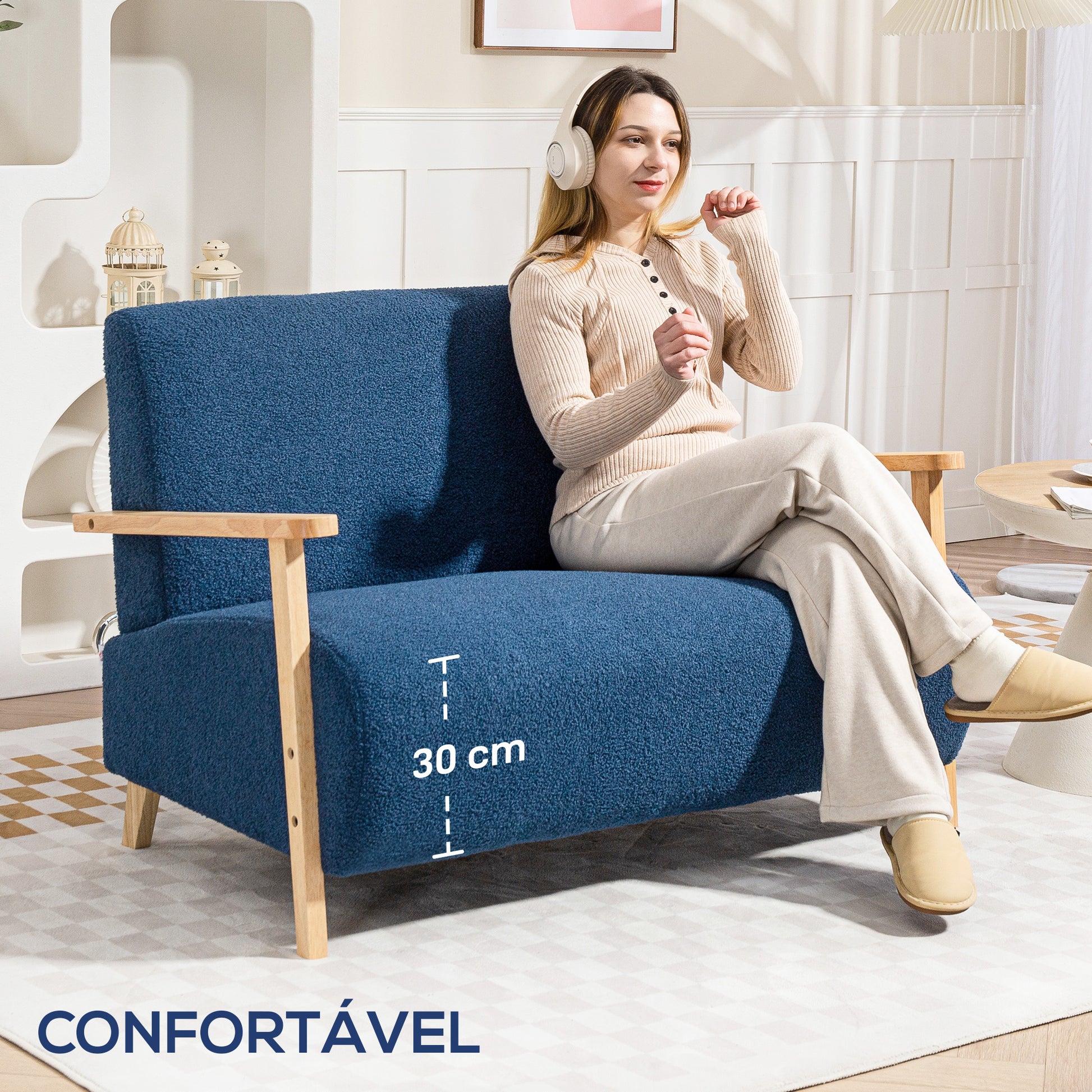 - Materiais: Borreguito sintético (100% poliéster) e espuma de alta densidade, com apoios de braços e pés em madeira de borracha