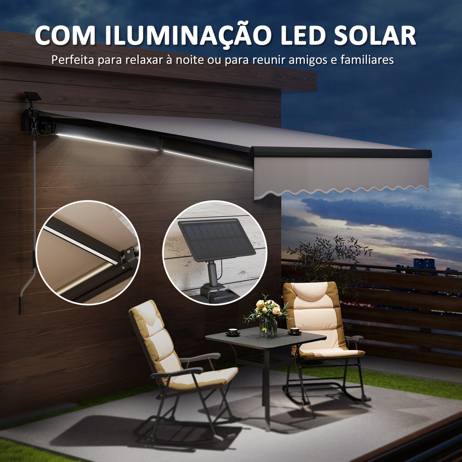 Transforme o seu espaço exterior num refúgio acolhedor com o Toldo Manual Retrátil Creme Branco. Este toldo versátil vem equipado com luzes LED solares, proporcionando um ambiente agradável durante as noites. Com um tecido tingido de 280 g/m² com proteção UPF50+, garante sombra ideal e proteção solar duradoura.