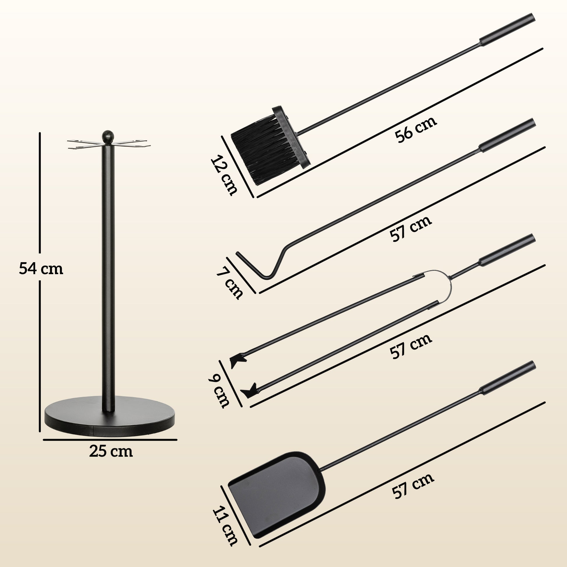 - Medidas: Suporte Ø25x54 cm; Escova 56x12 cm; Pá 57x11 cm; Tenaz 57x9 cm; Atiçador 57x7 cm