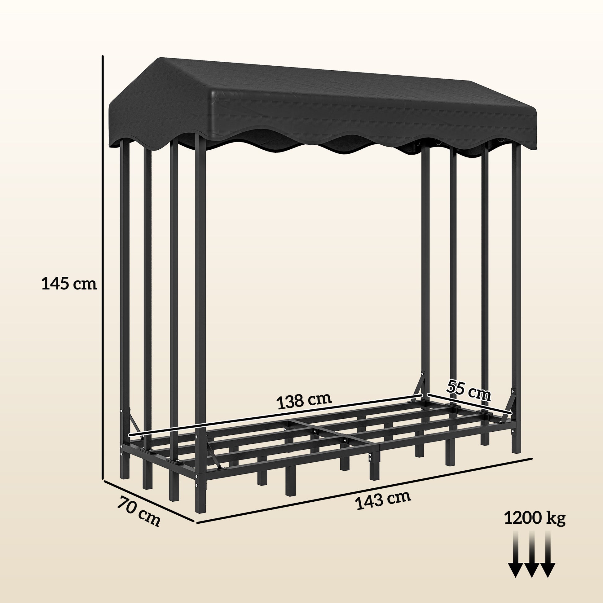 Este suporte para lenha é a solução ideal para manter a sua lenha organizada e seca. Com medidas de 143x70x145 cm, oferece um amplo espaço de armazenamento para até 1200 kg de lenha cortada.