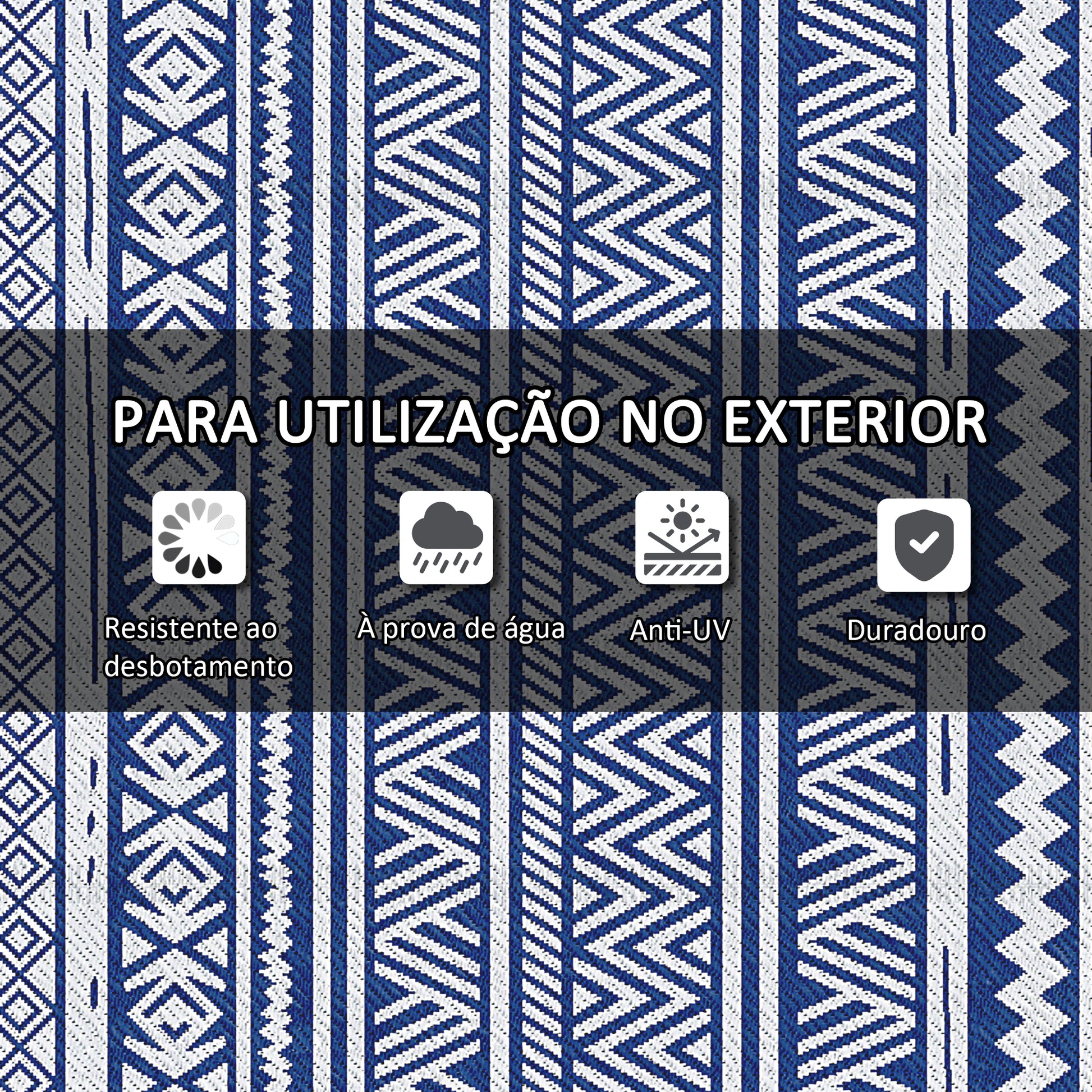 Este tapete de exterior elegante oferece um toque de elegância e estilo que transformará instantaneamente qualquer ambiente ao ar livre. Com um desenho com diferentes formas geométricas e a combinação das cores azul e branco, não apenas acrescenta charme, mas também o torna convidativo para momentos relaxantes e reuniões ao ar livre.