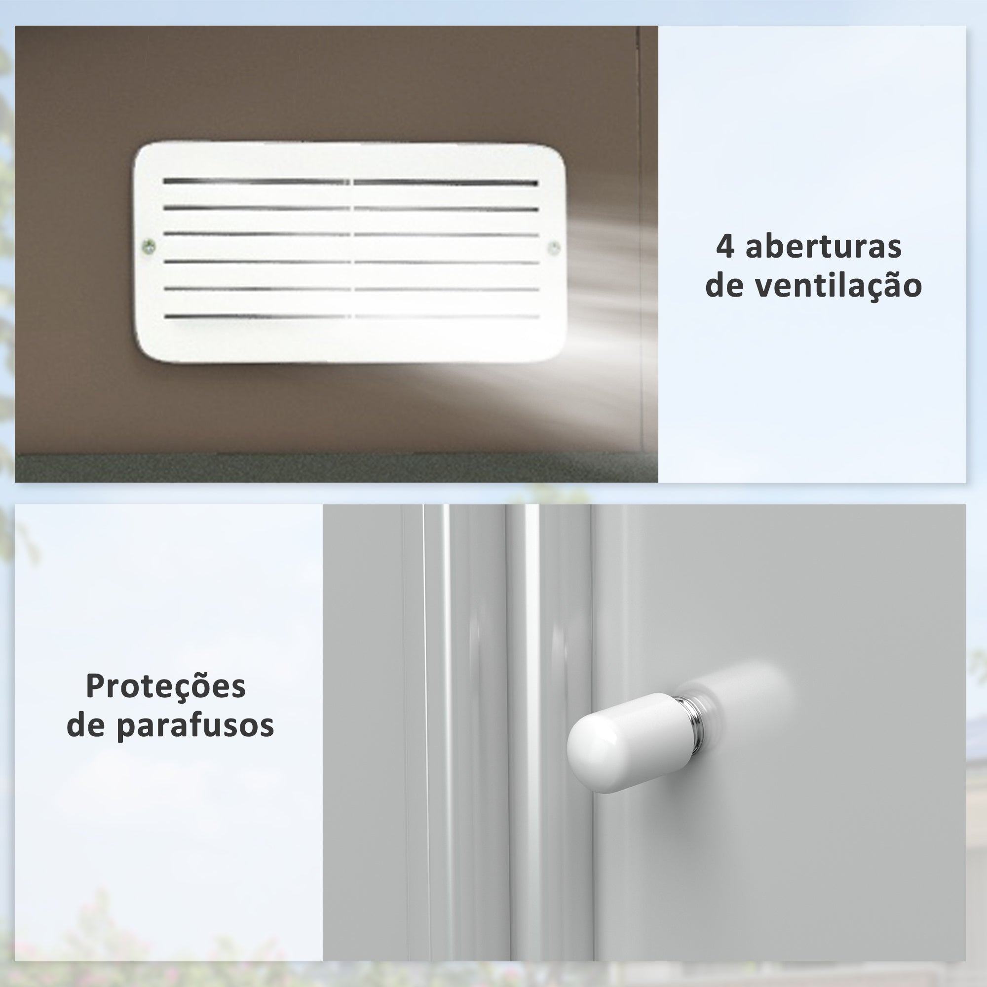 - Benefícios: Telhado inclinado para evitar acúmulo de água, quatro aberturas de ventilação para iluminação e fluxo de ar, portas deslizantes para acesso fácil e economia de espaço