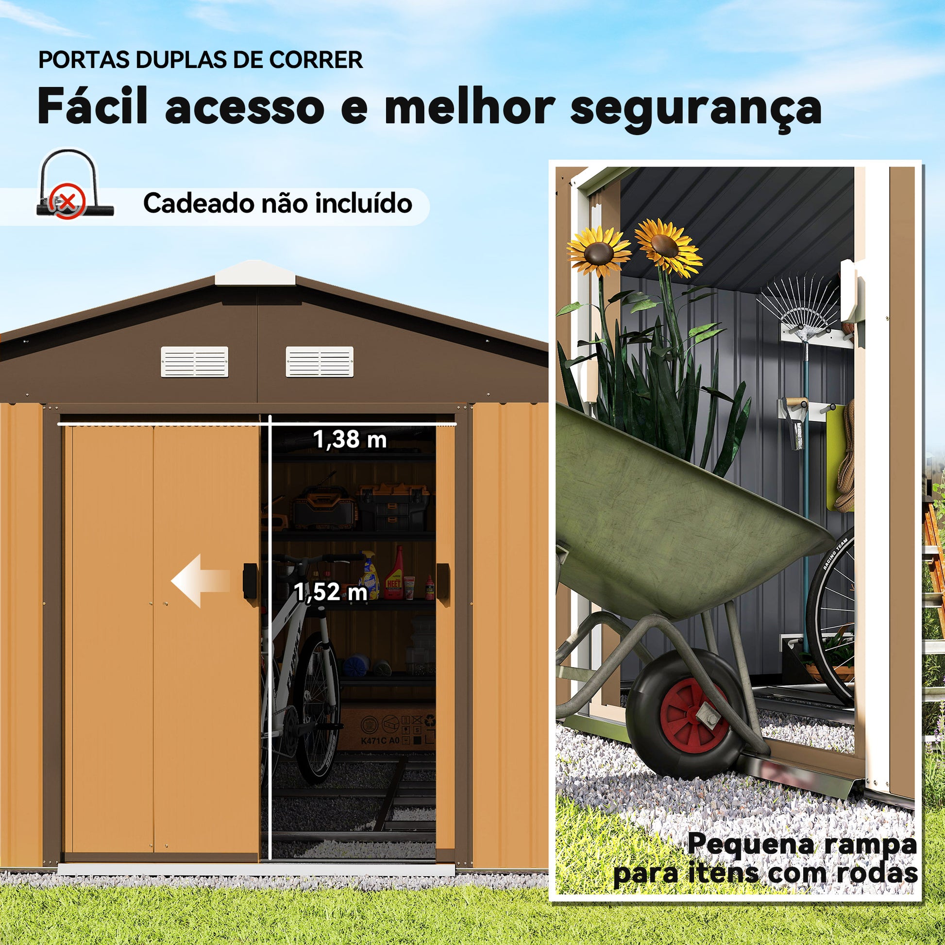 - Benefícios: Estrutura resistente e estável, base reforçada, teto inclinado para escoamento da água, boa ventilação com 4 aberturas, portas de correr duplas para fácil acesso.