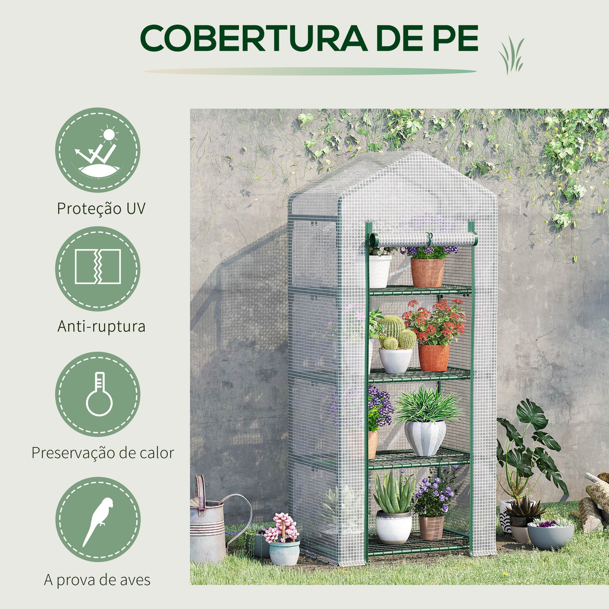 - Benefícios: 4 prateleiras para espaço suficiente, cobertura que permite a entrada de luz solar, estrutura robusta para uso prolongado