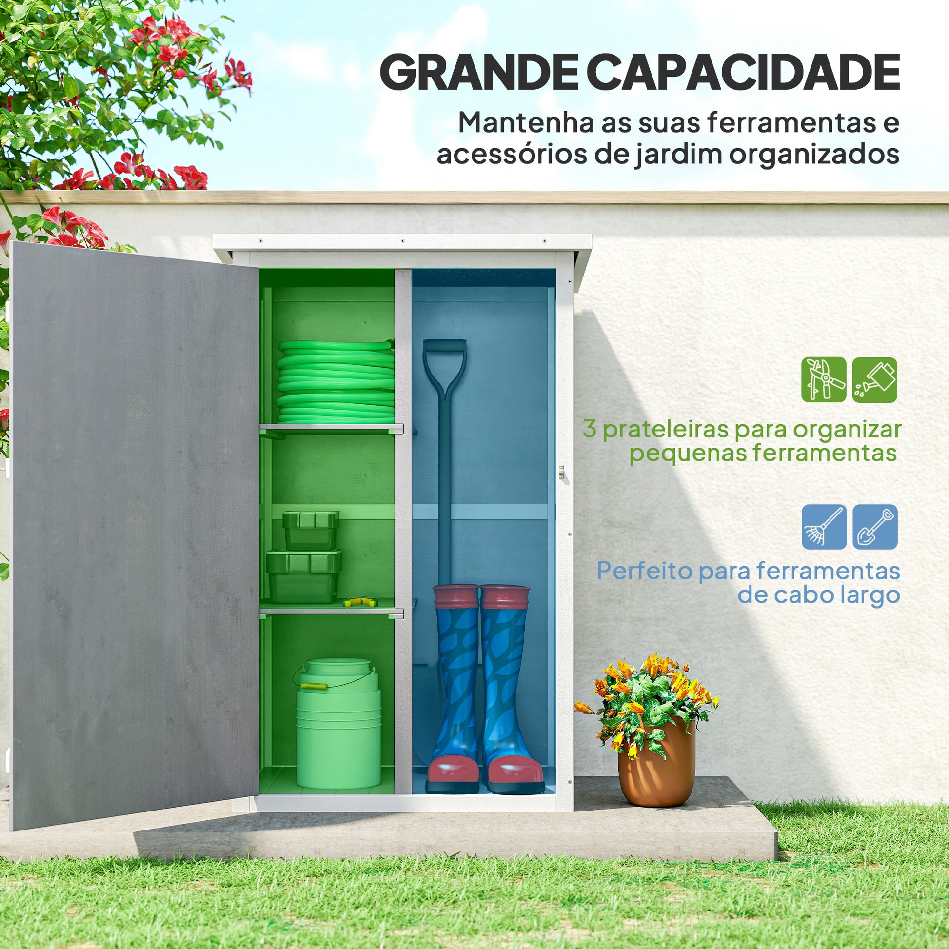- Usos recomendados: Armazenamento de ferramentas de jardinagem, equipamentos e acessórios.