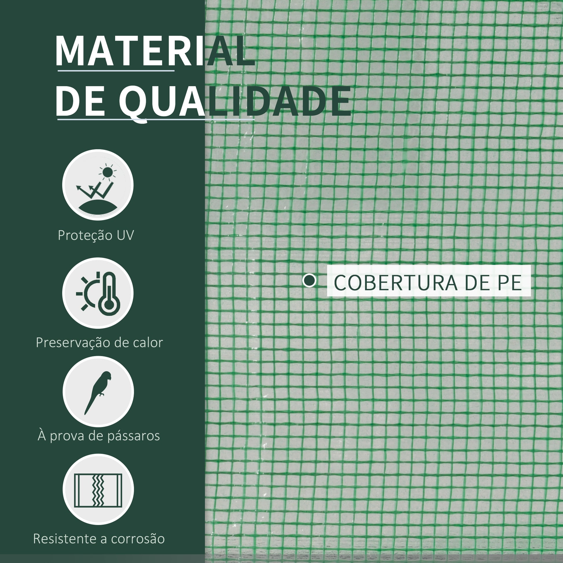 - Materiais: Aço galvanizado e cobertura de plástico de polietileno resistente.