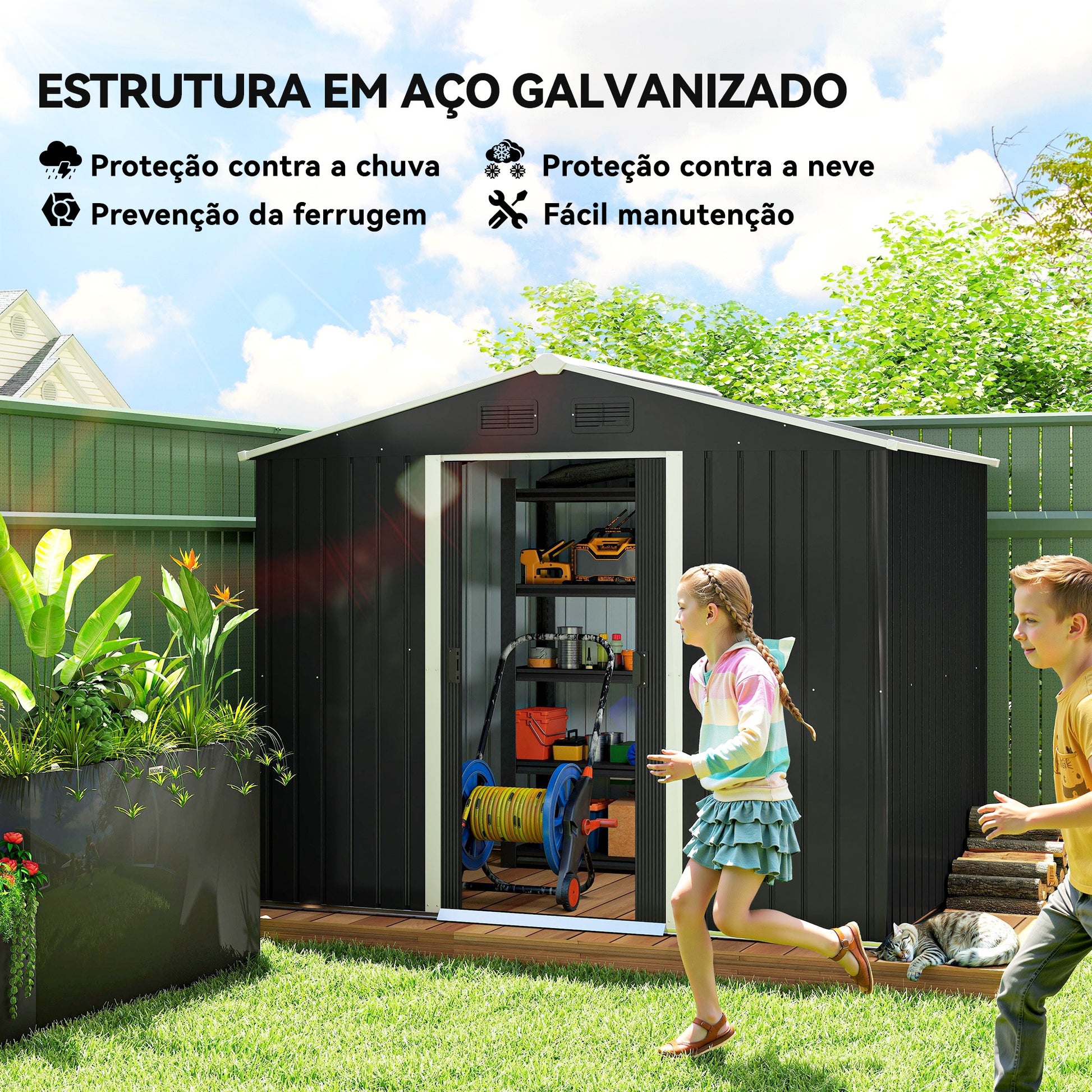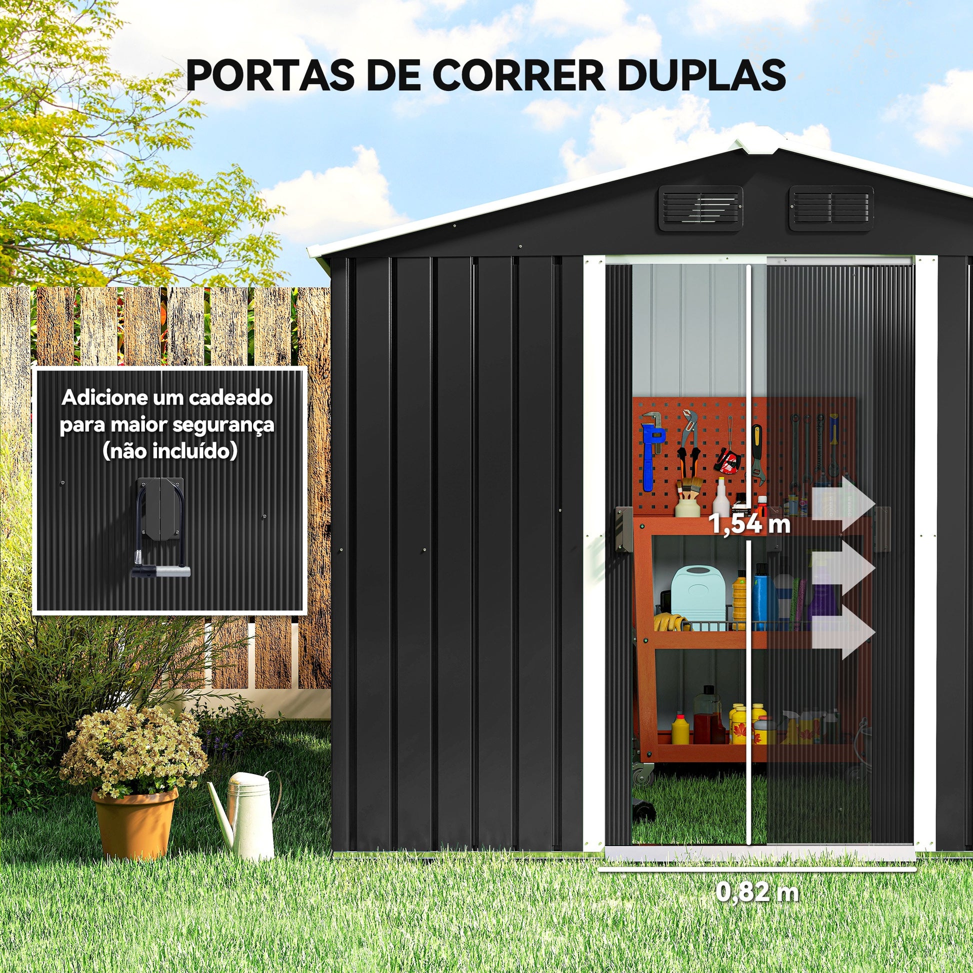 - Usos Recomendados: Armazenamento de ferramentas de jardinagem, bicicletas e outros equipamentos de exterior