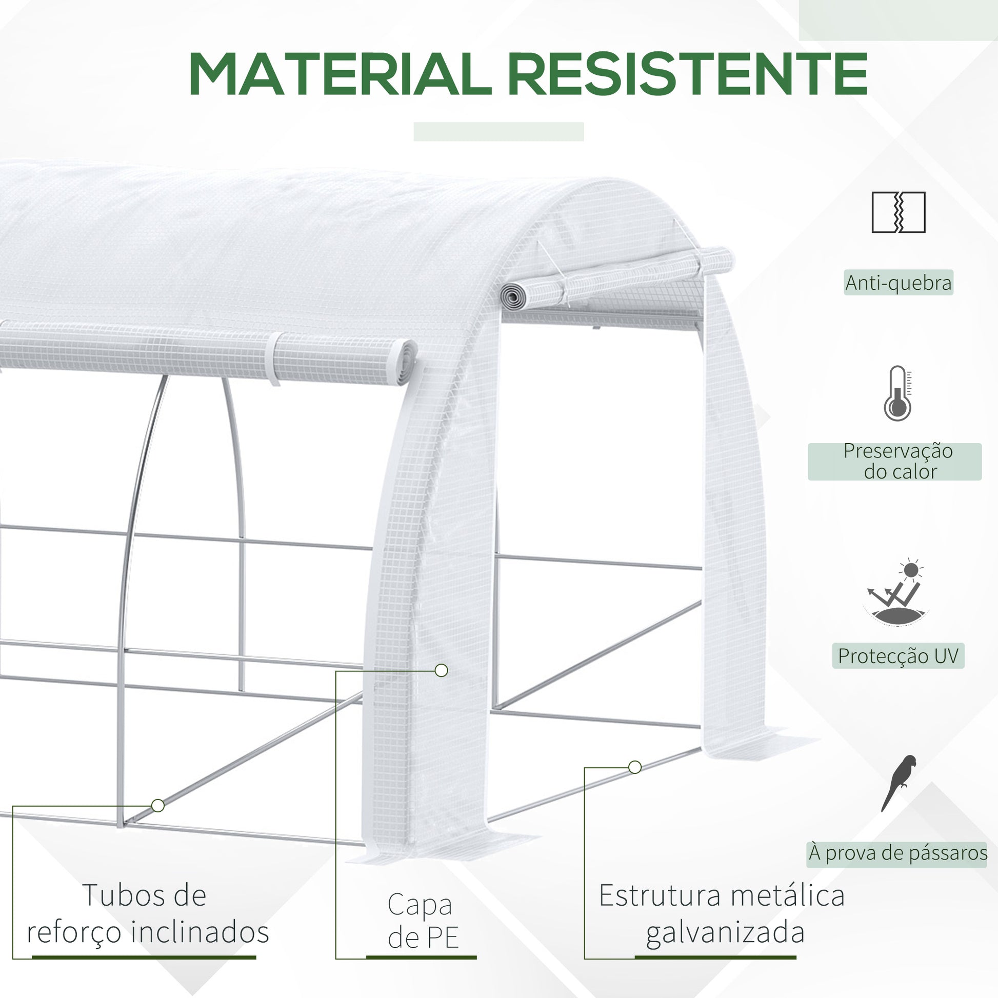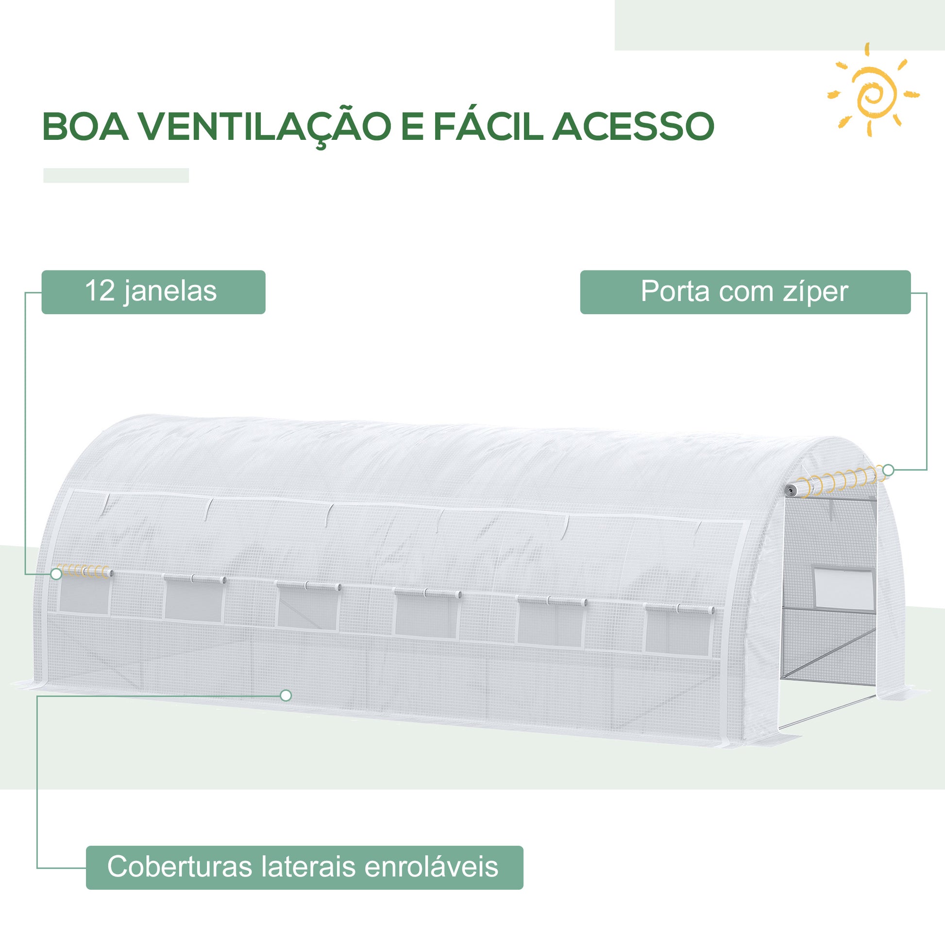 - Benefícios: Cobertura impermeável e resistente aos raios UV, boa ventilação com porta e 12 janelas enroláveis, estrutura resistente à corrosão