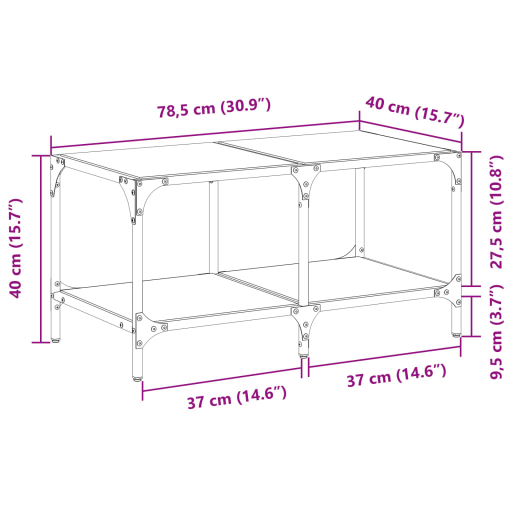 Mesa de centro com topo em vidro preto 78,5x40x40 cm aço