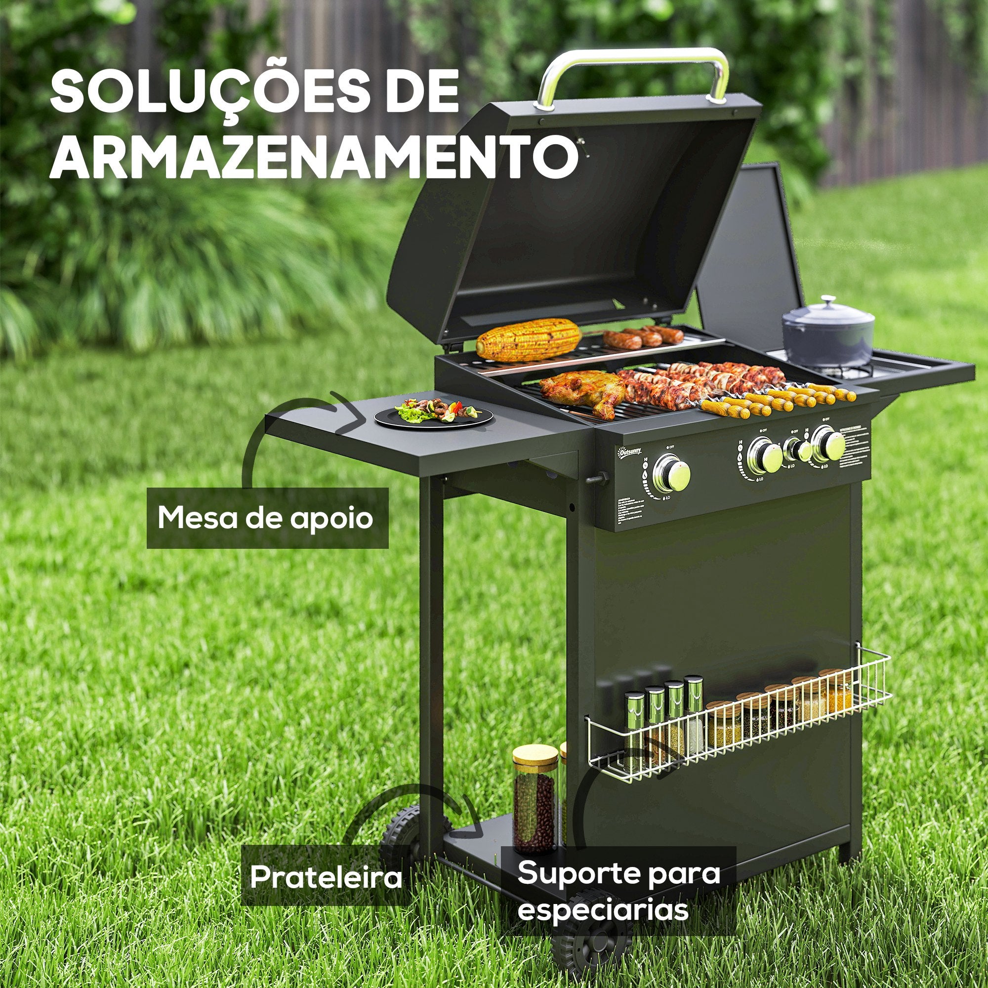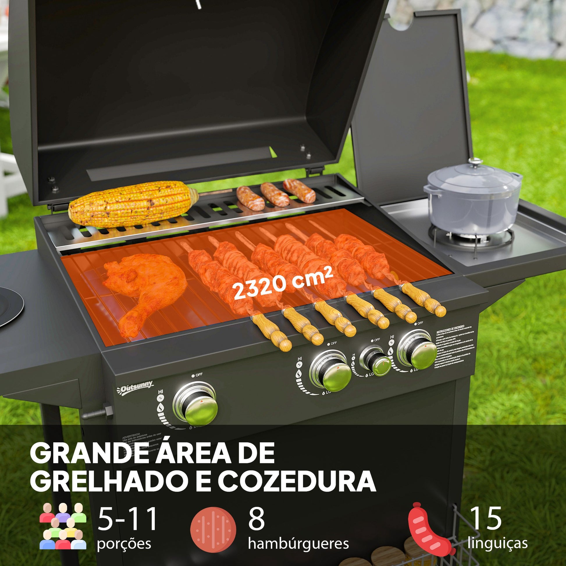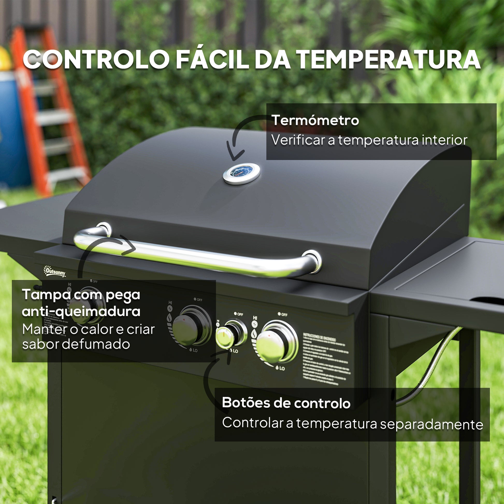 - Benefícios: Acendimento piezoelétrico, armazenamento eficiente, tampa com termómetro, design prático e recolhedor de gordura removível