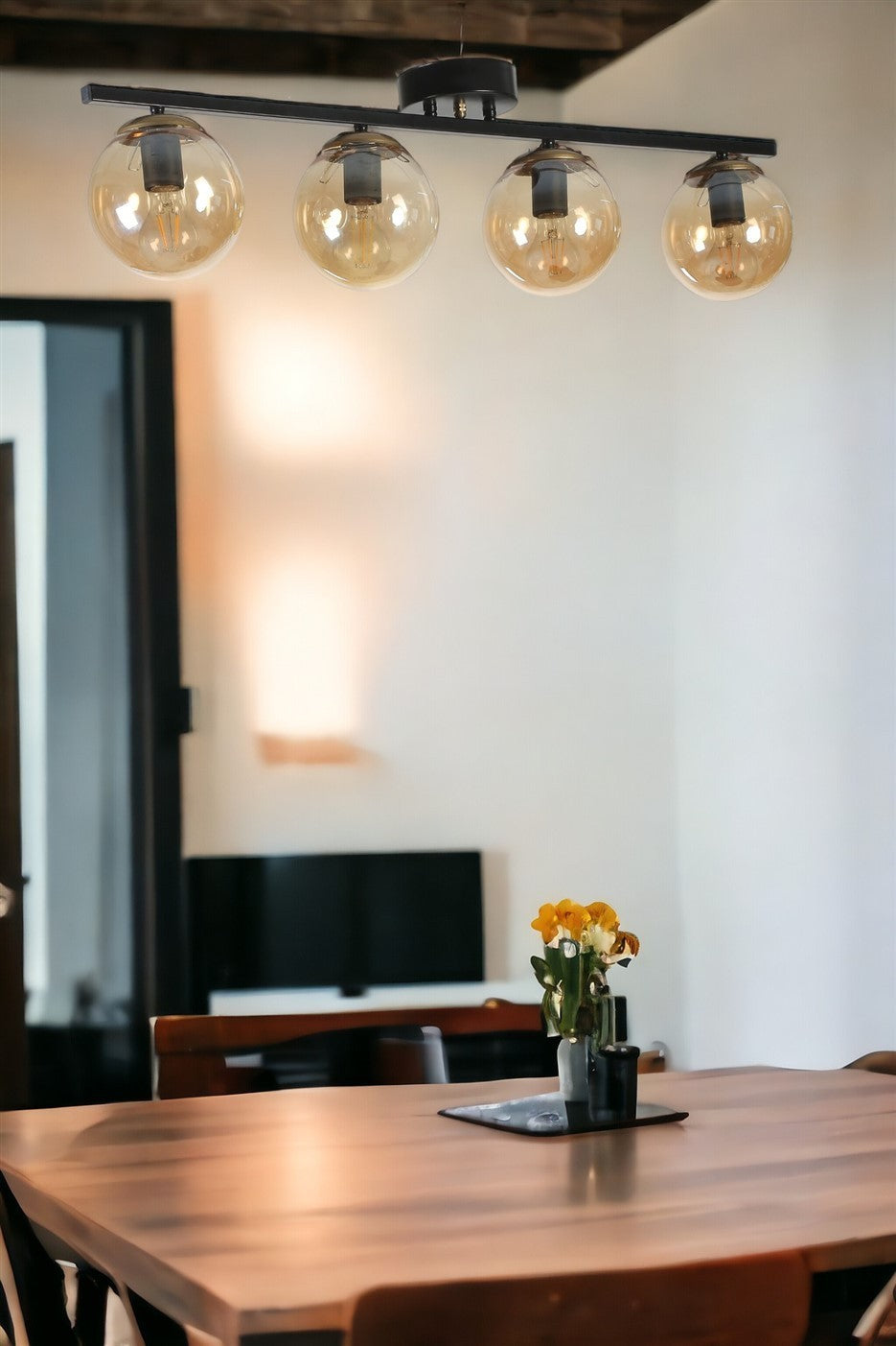 O corpo metálico elegante deste lustre é lindamente complementado pela cúpula de vidro, criando um visual moderno e estiloso que realçará a estética da sua casa. As cores preta e âmbar adicionam um toque de calor e luxo, tornando este lustre a peça de destaque perfeita para qualquer ambiente.
