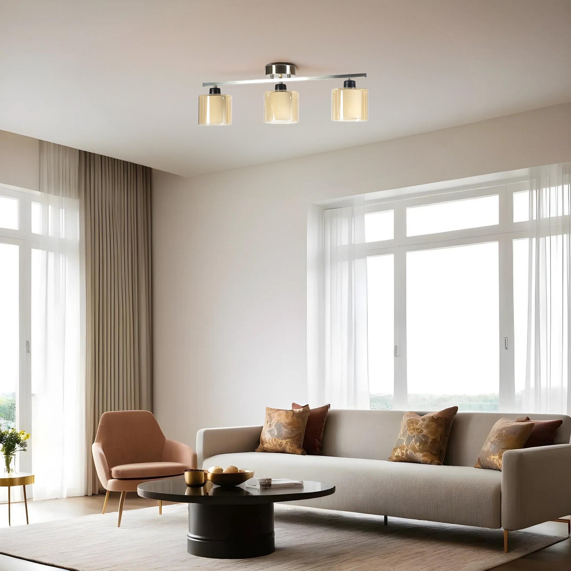 Transforme o seu espaço de vida com o nosso deslumbrante candeeiro, uma verdadeira obra-prima que irá elevar o ambiente de qualquer divisão. A combinação do elegante acabamento cromado mate e da tampa de vidro âmbar quente cria um efeito visual hipnotizante que irá cativar qualquer pessoa que entre em sua casa.