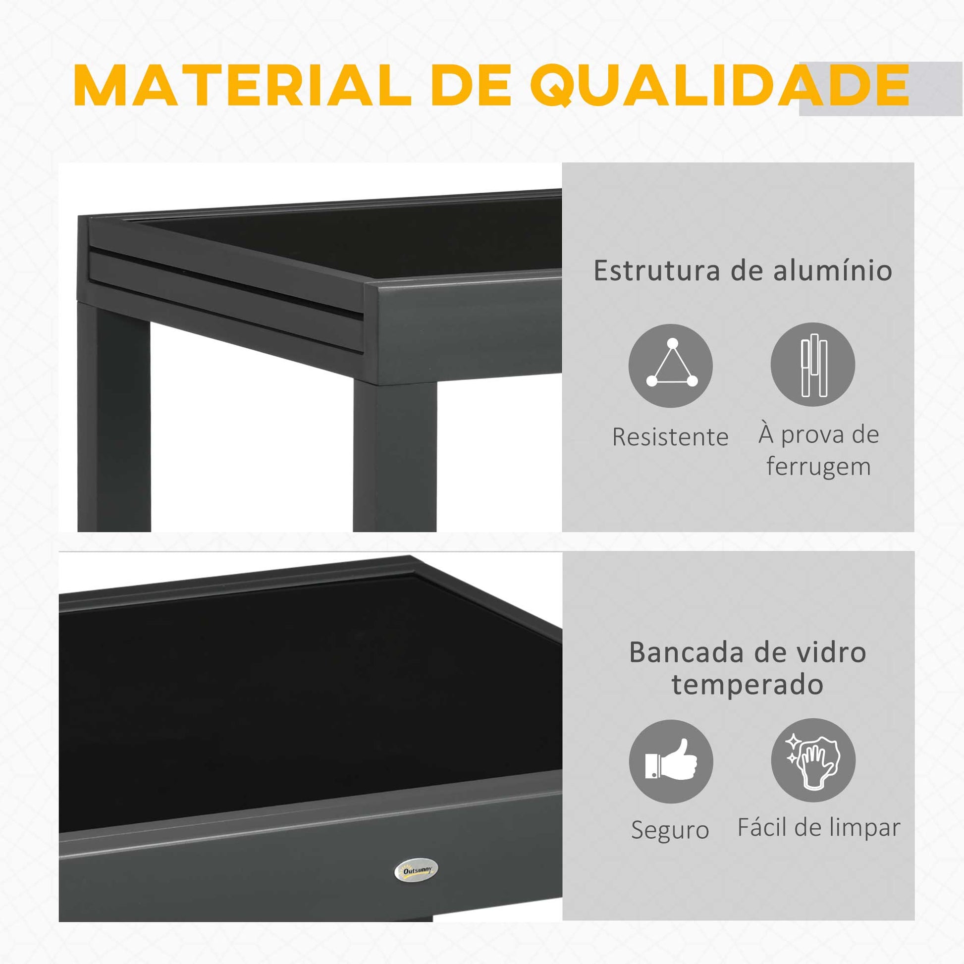 - Benefícios: Estrutura resistente a intempéries, bancada de vidro temperado fácil de limpar, pés ajustáveis para estabilidade.