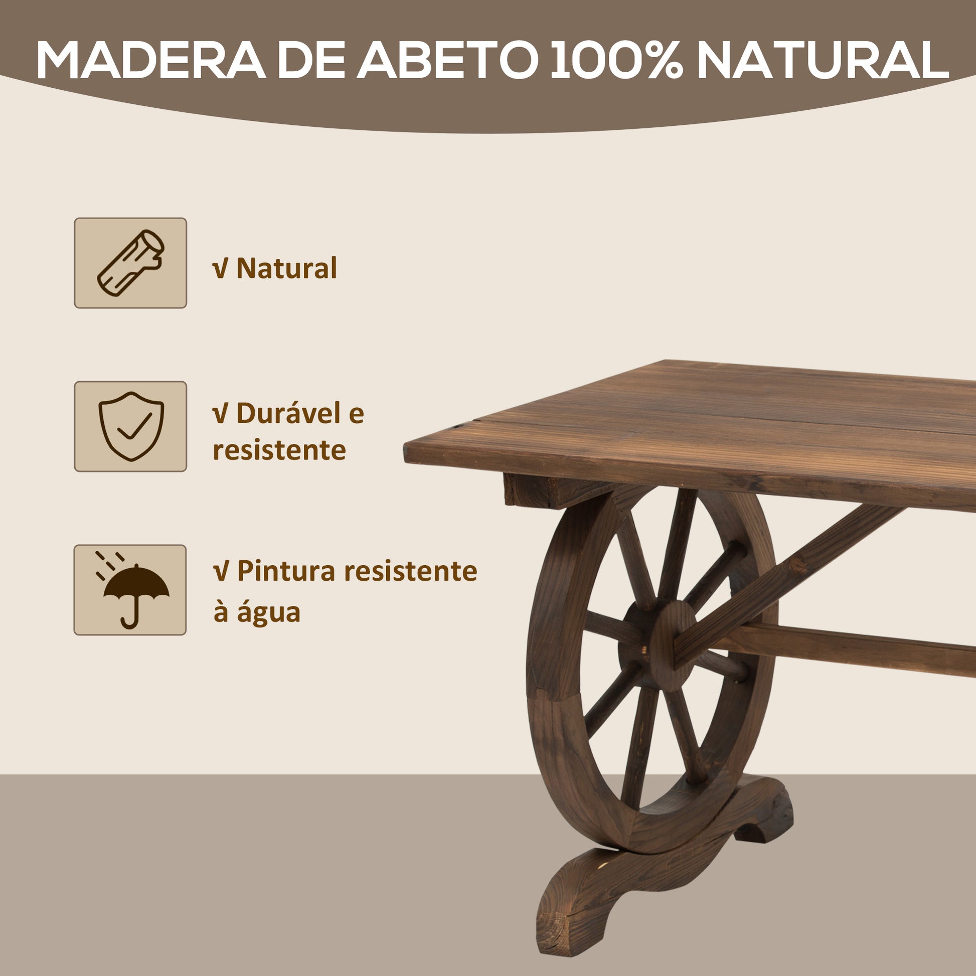 - Benefícios: Resistente às intempéries, acabamento resistente à água, estilo rústico com pés em forma de rodas.