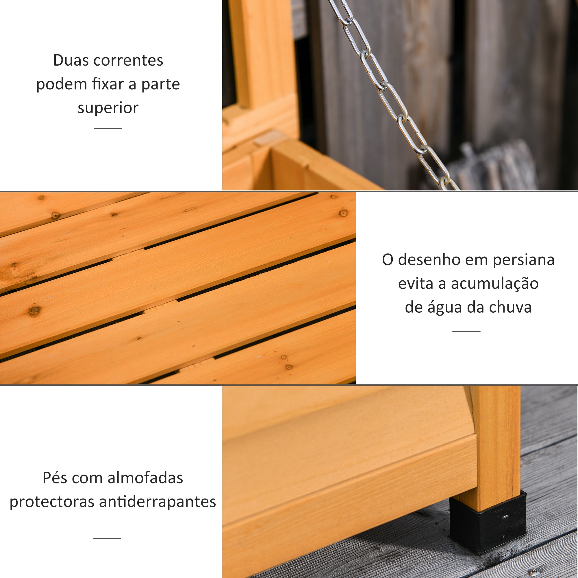 - Materiais: Fabricado em madeira maciça de abeto com tratamento impermeabilizante para resistir às intempéries e à água.