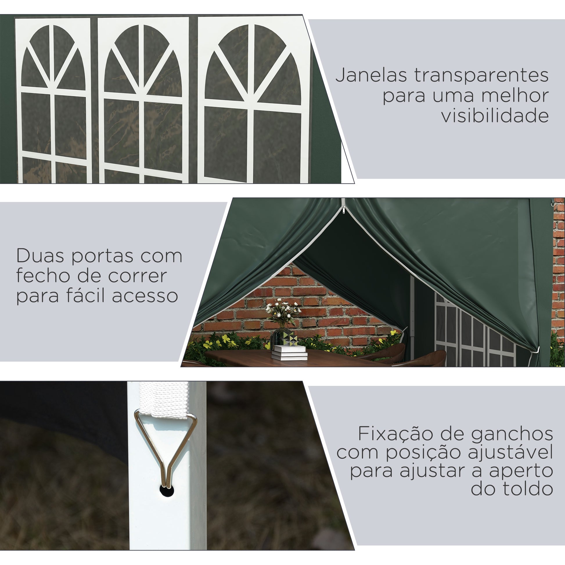 Esta tenda de jardim verde é perfeita para festas familiares, casamentos, piqueniques e eventos ao ar livre. Com medidas de 295x295x196-258 cm, é espaçosa e versátil.