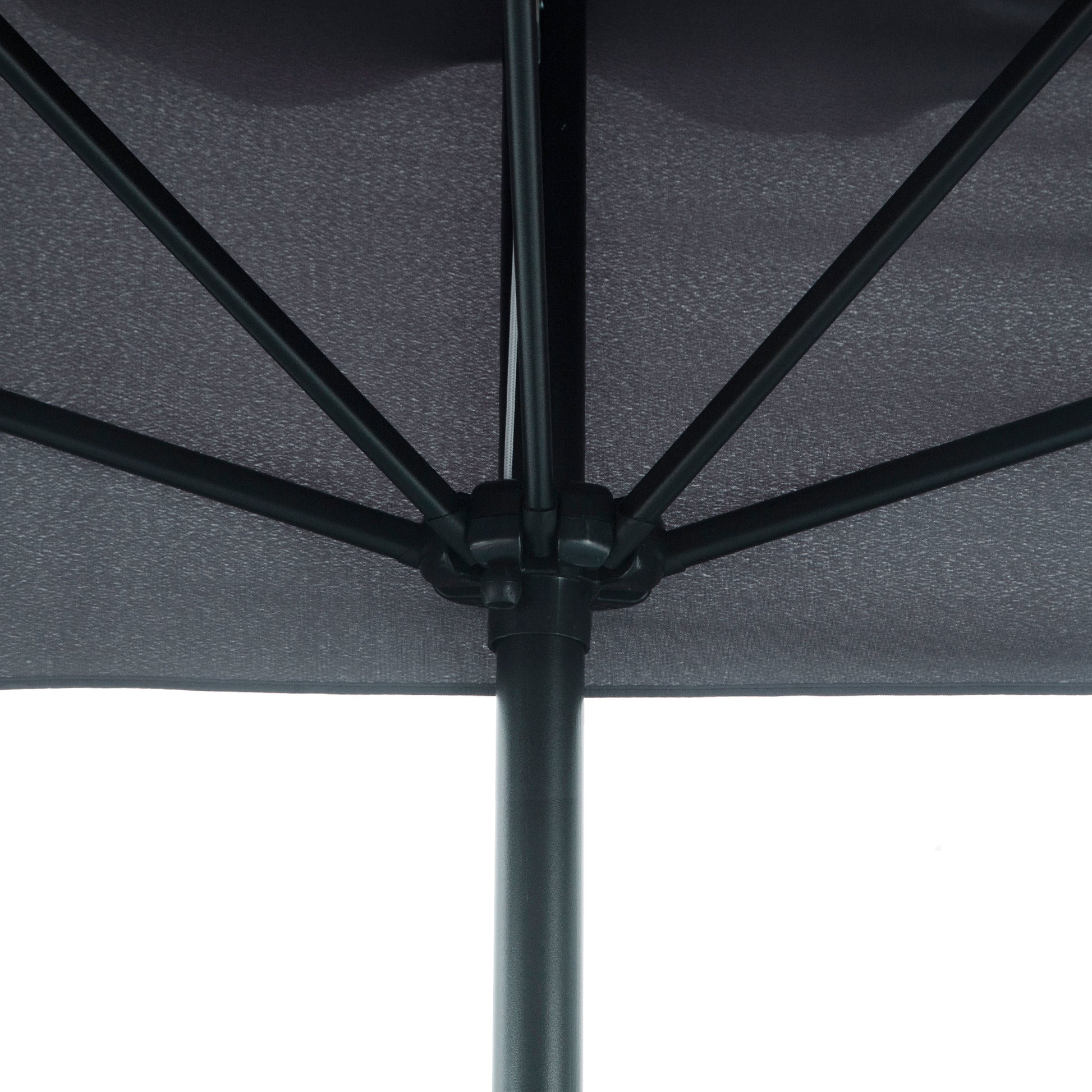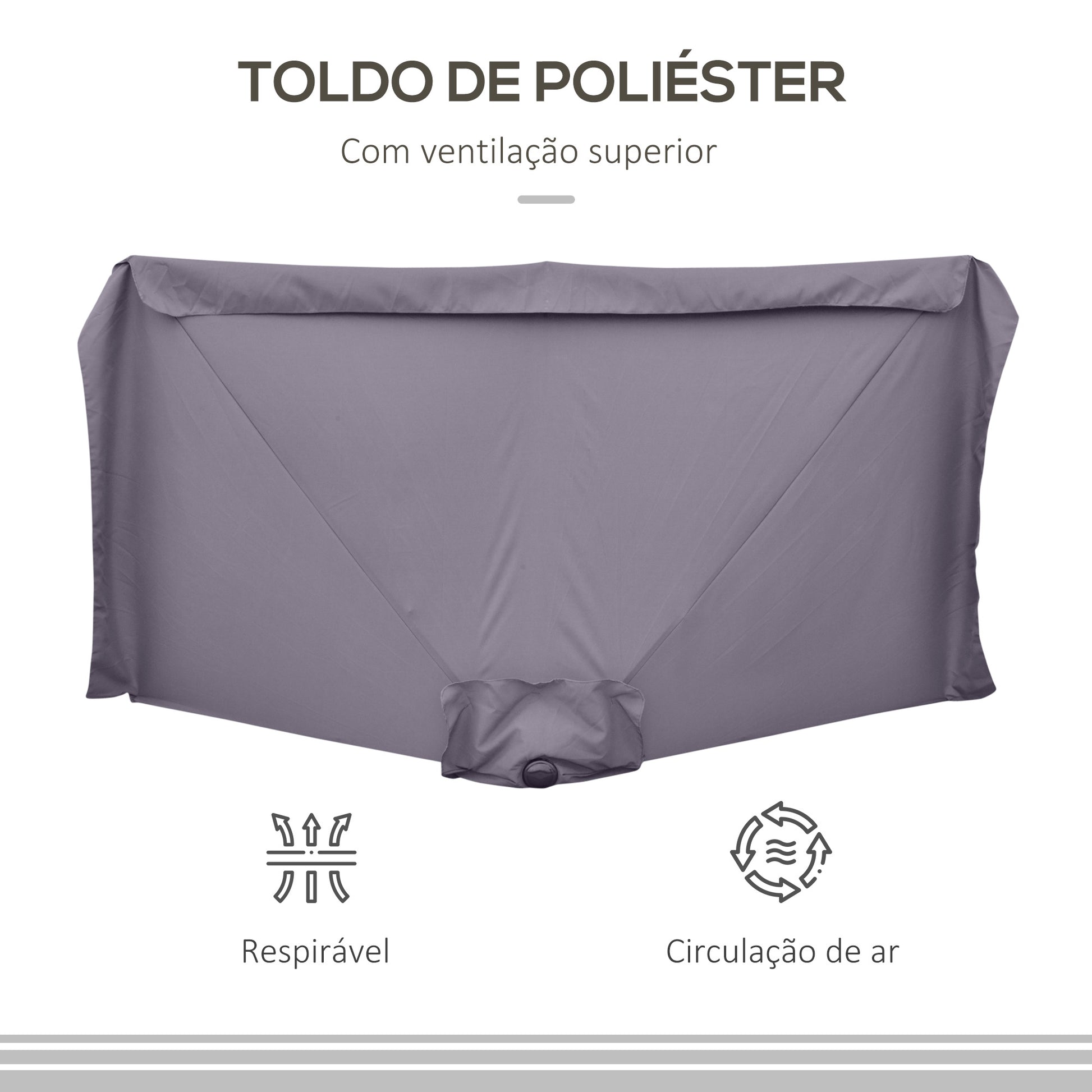 Este chapéu de sol de parede apresenta uma estrutura metálica robusta com 5 hastes que suportam o tecido de poliéster resistente aos raios UV, garantindo durabilidade e resistência.