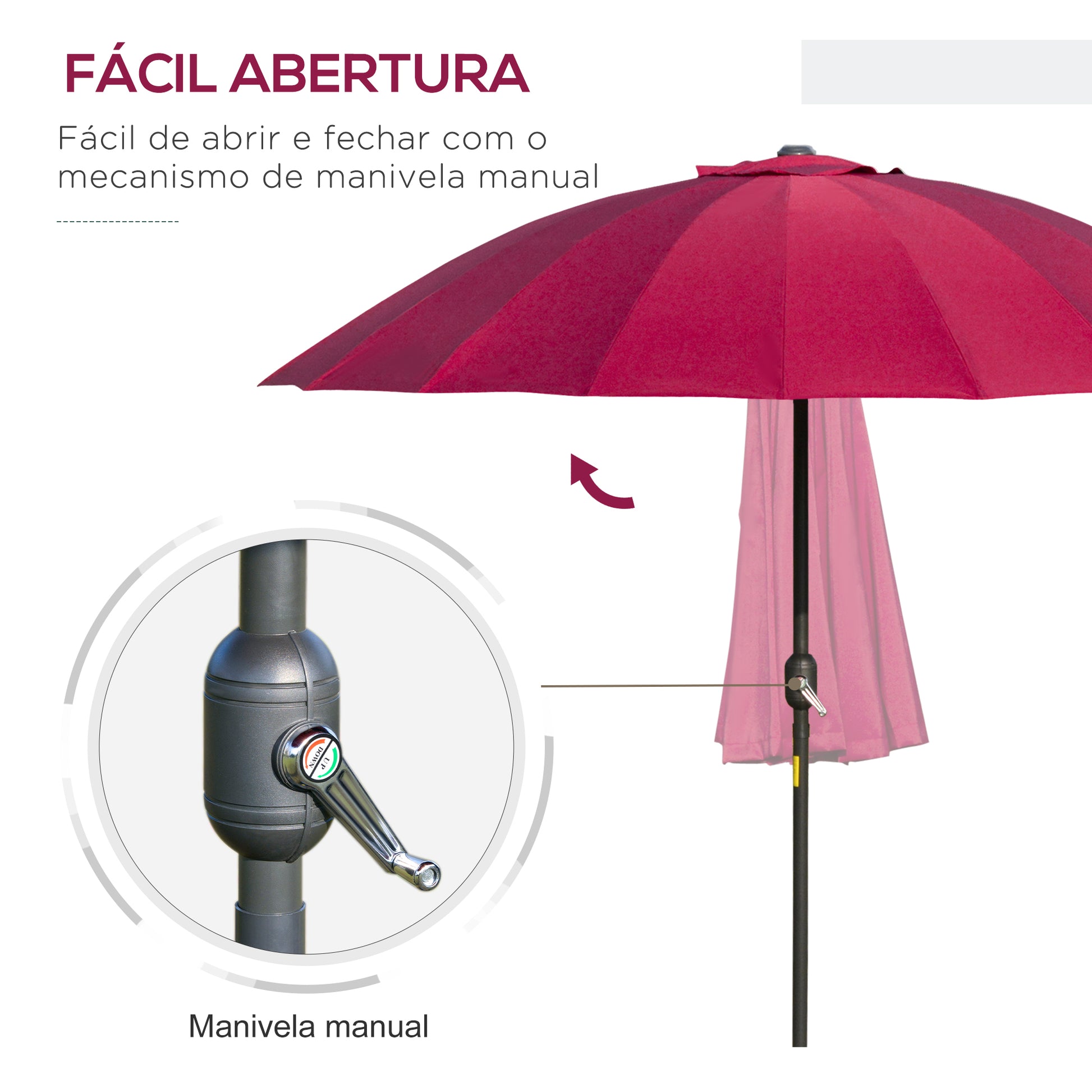 - Outras especificações relevantes: Mastro com mecanismo de inclinação, abertura fácil com manivela, diâmetro de 2,5 m para sombra em mesas de 4 a 6 pessoas