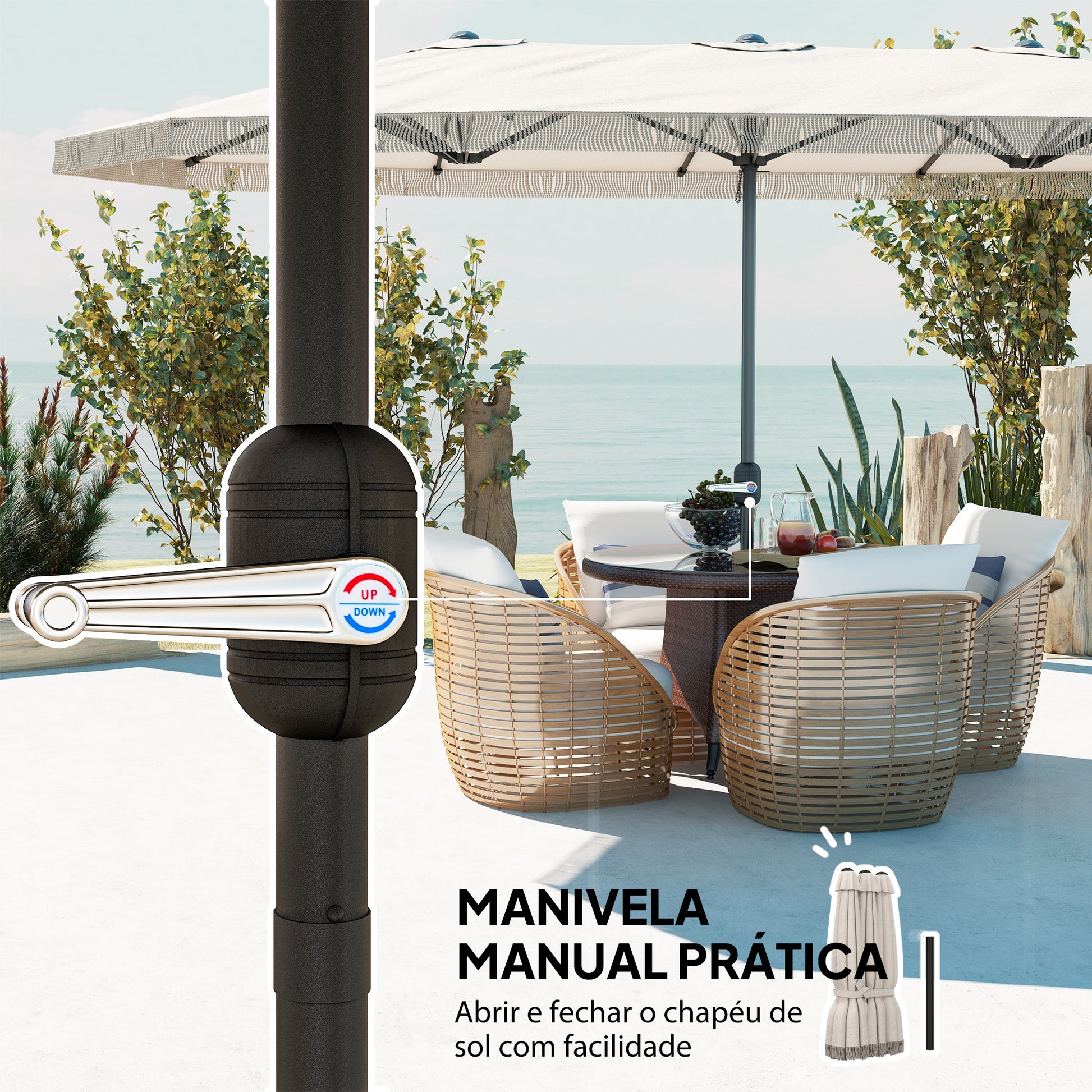 - Benefícios: Sistema de manivela prático para abrir e fechar facilmente, mastro de aço revestido a pó e 12 hastes de aço inoxidável para máxima estabilidade.