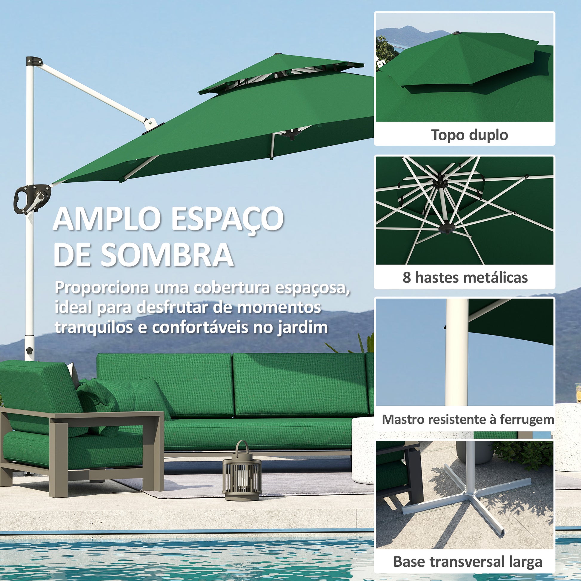 O Chapéu de Sol Verde Escuro Ø292x247 cm com Manivela Rotativa 360° é a solução perfeita para criar um espaço de sombra confortável no seu jardim ou área exterior. Este chapéu de sol excêntrico proporciona sombra ampla sem um mastro central, permitindo uma maior flexibilidade no uso do espaço.