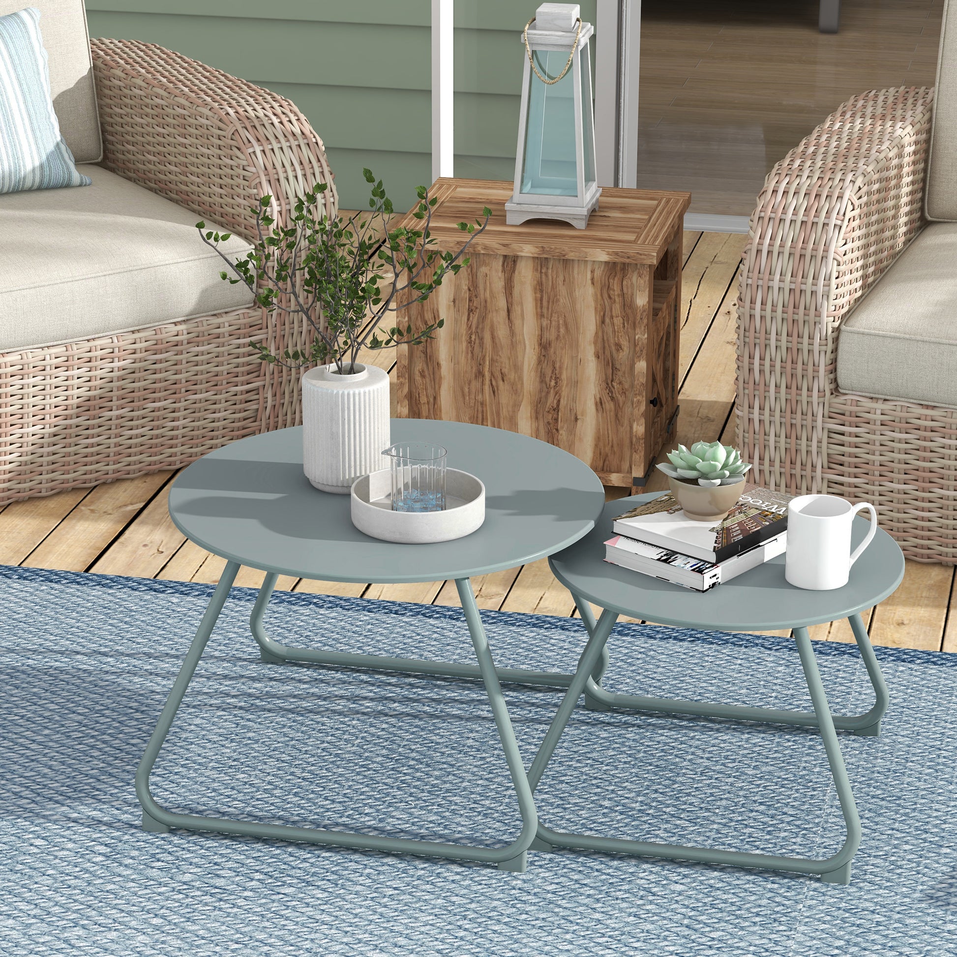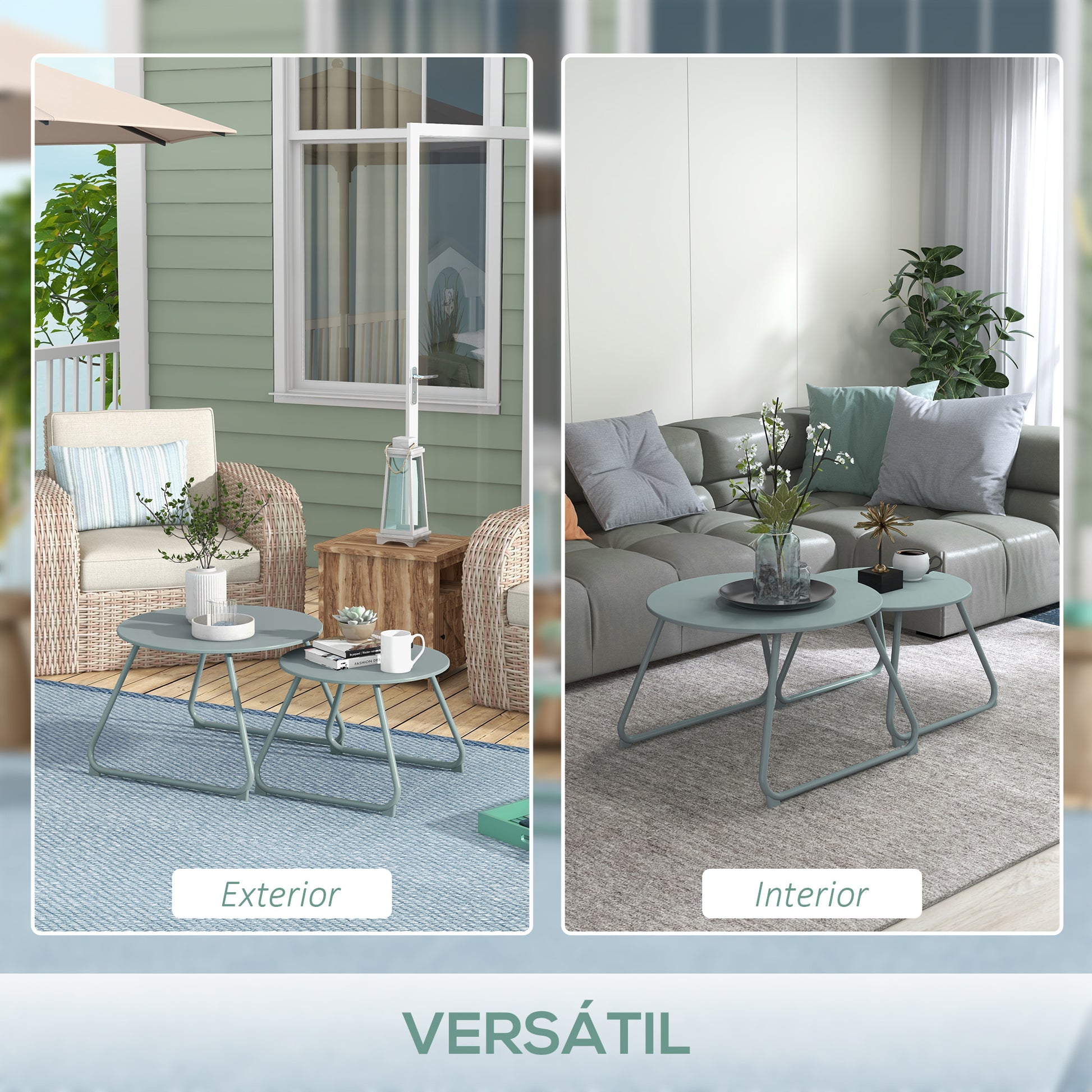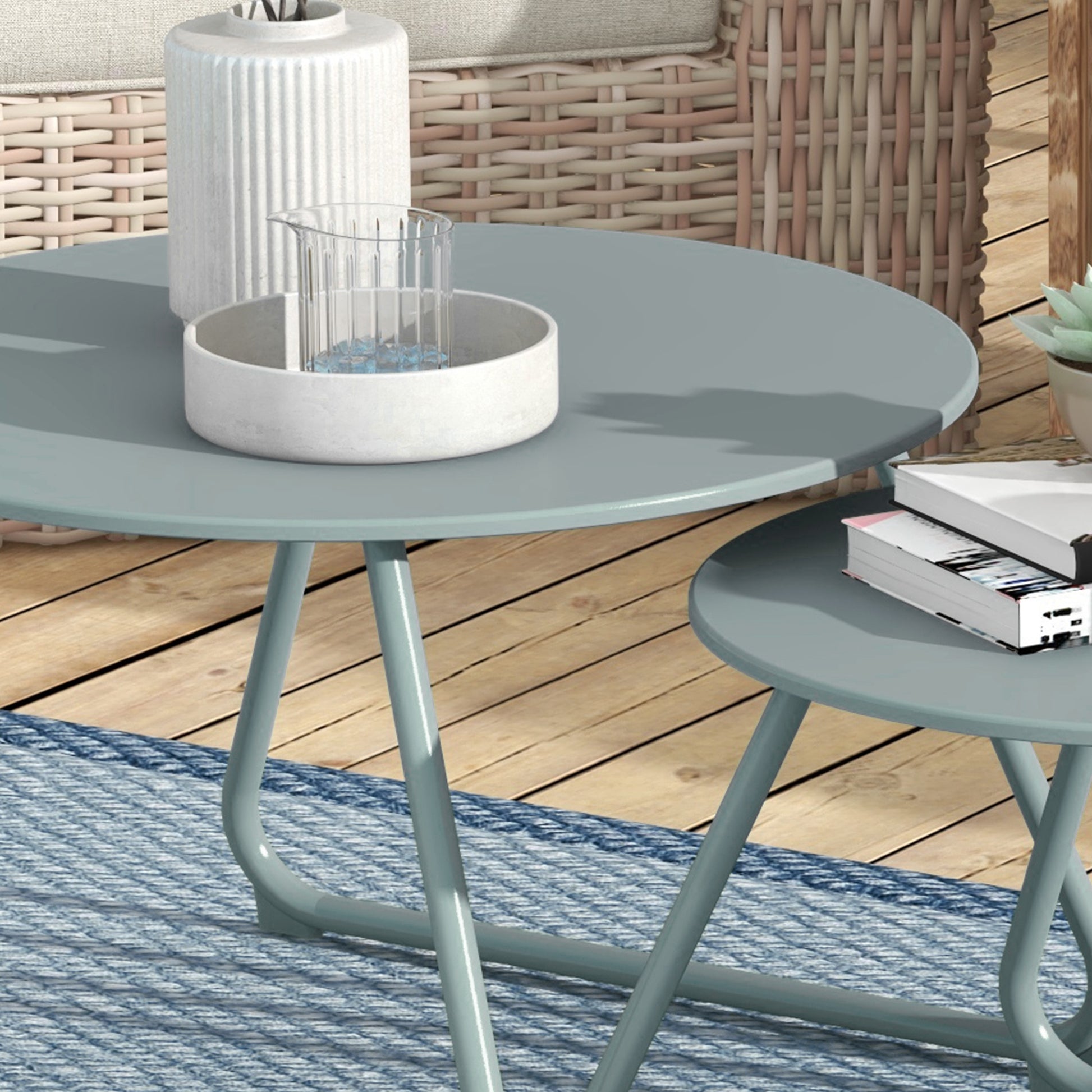 Adicione um toque de elegância ao seu espaço exterior com este conjunto de 2 mesas auxiliares empilháveis em tom azul pastel. Perfeitas para varandas, terraços e jardins, estas mesas redondas são ideais para integrar na sua decoração exterior.