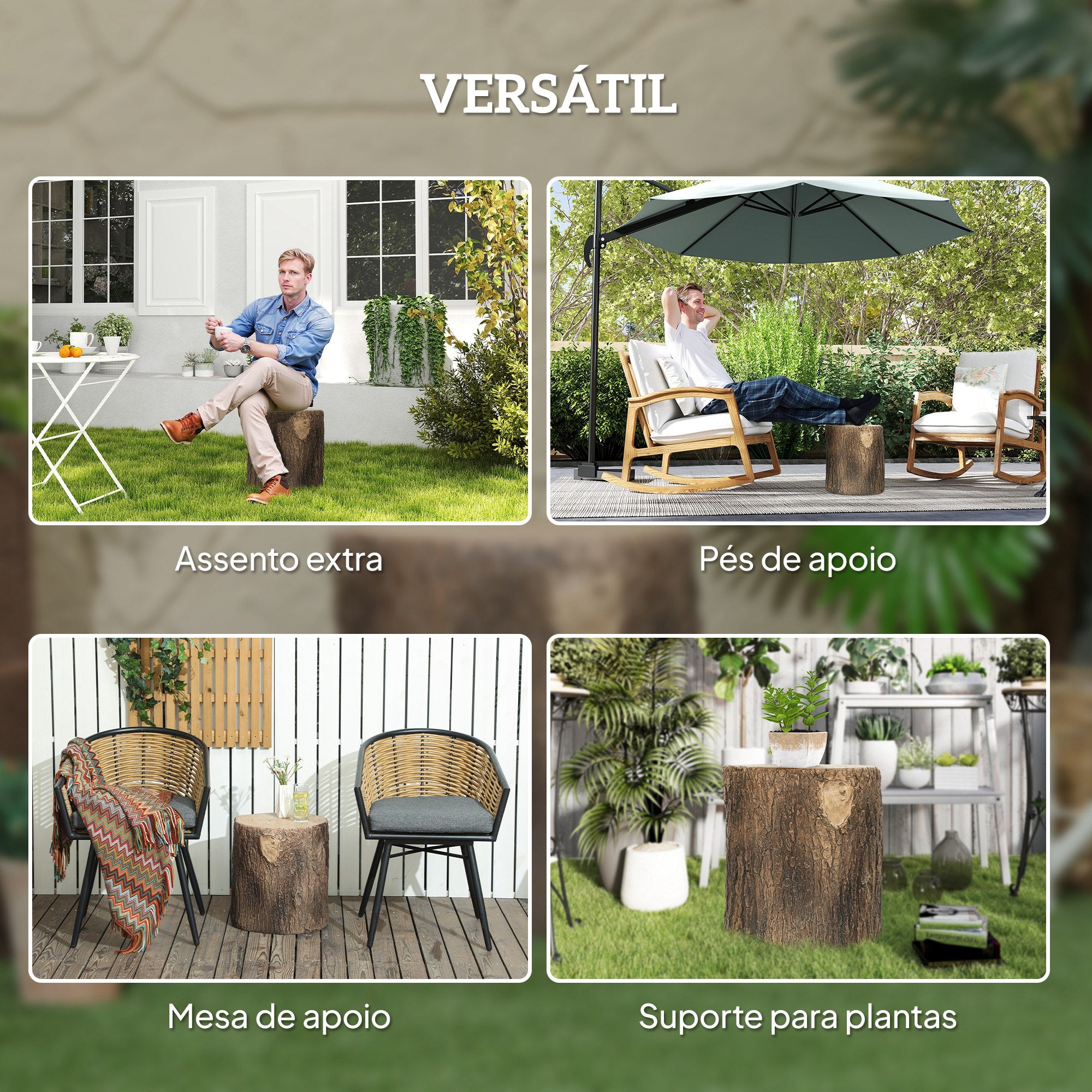 - Usos Recomendados: Pode ser utilizado como assento extra, suporte para plantas, mesa lateral ou elemento decorativo, tanto em ambientes internos como externos.