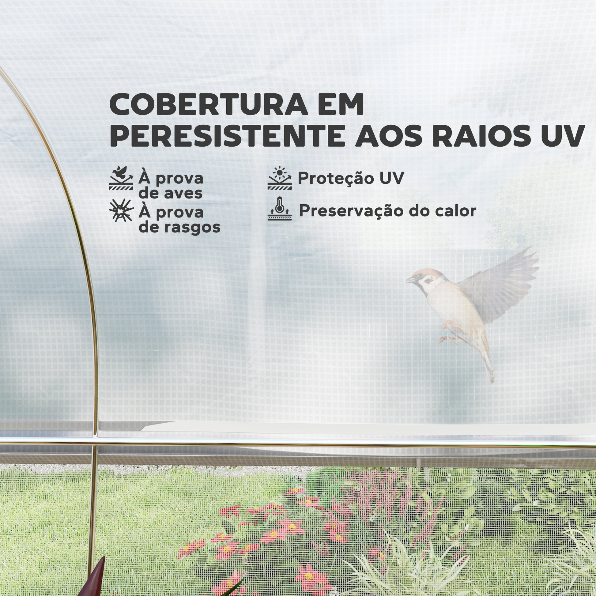 Esta estufa tipo túnel de cor branca, com medidas de 595x300x200 cm, é perfeita para o cultivo de plantas durante todo o ano. Com uma cobertura de PE de 140g/㎡ e estrutura em aço galvanizado, oferece proteção UV, resistência ao vento e durabilidade.
