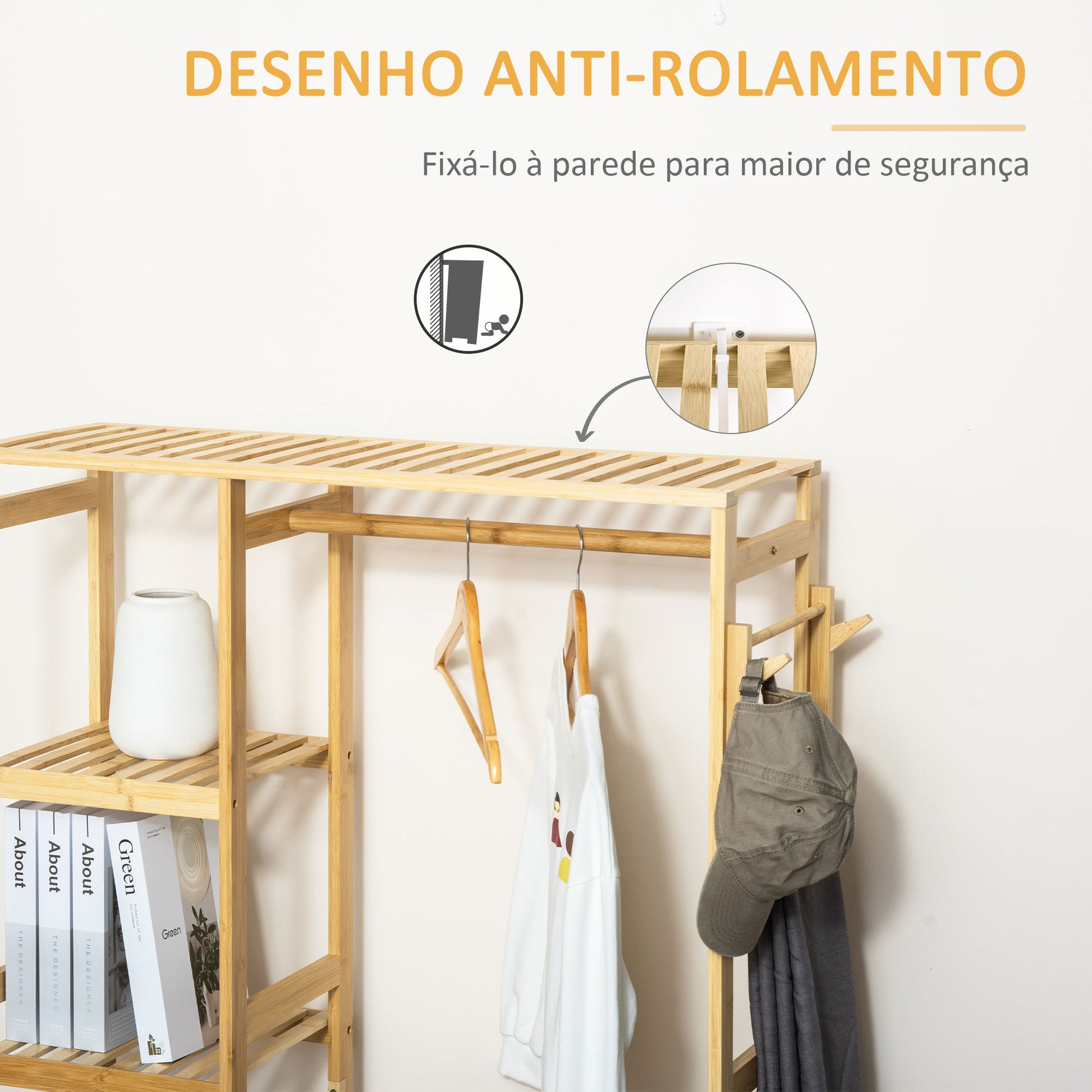 O Suporte Cabides de Bambu é a solução perfeita para manter a sua casa organizada e com um toque de elegância. Com um design minimalista em madeira natural, este suporte oferece 4 níveis de prateleiras, uma barra inferior e um cabide lateral para guardar roupas, bolsas e acessórios.