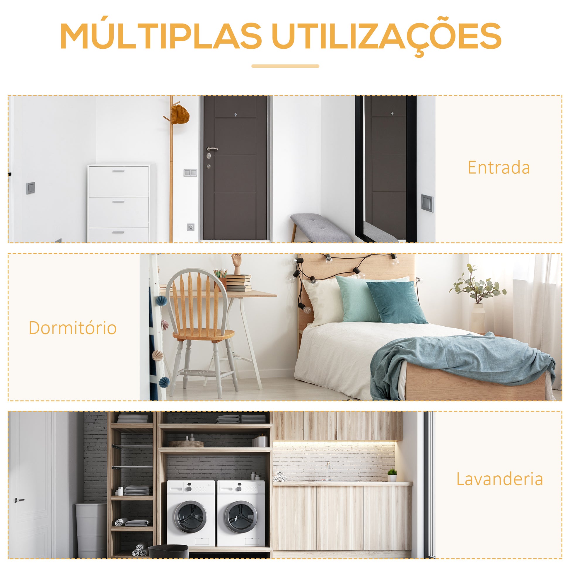 - Usos recomendados: Ideal para entrada, sala de estar e dormitório, ocupando pouco espaço.