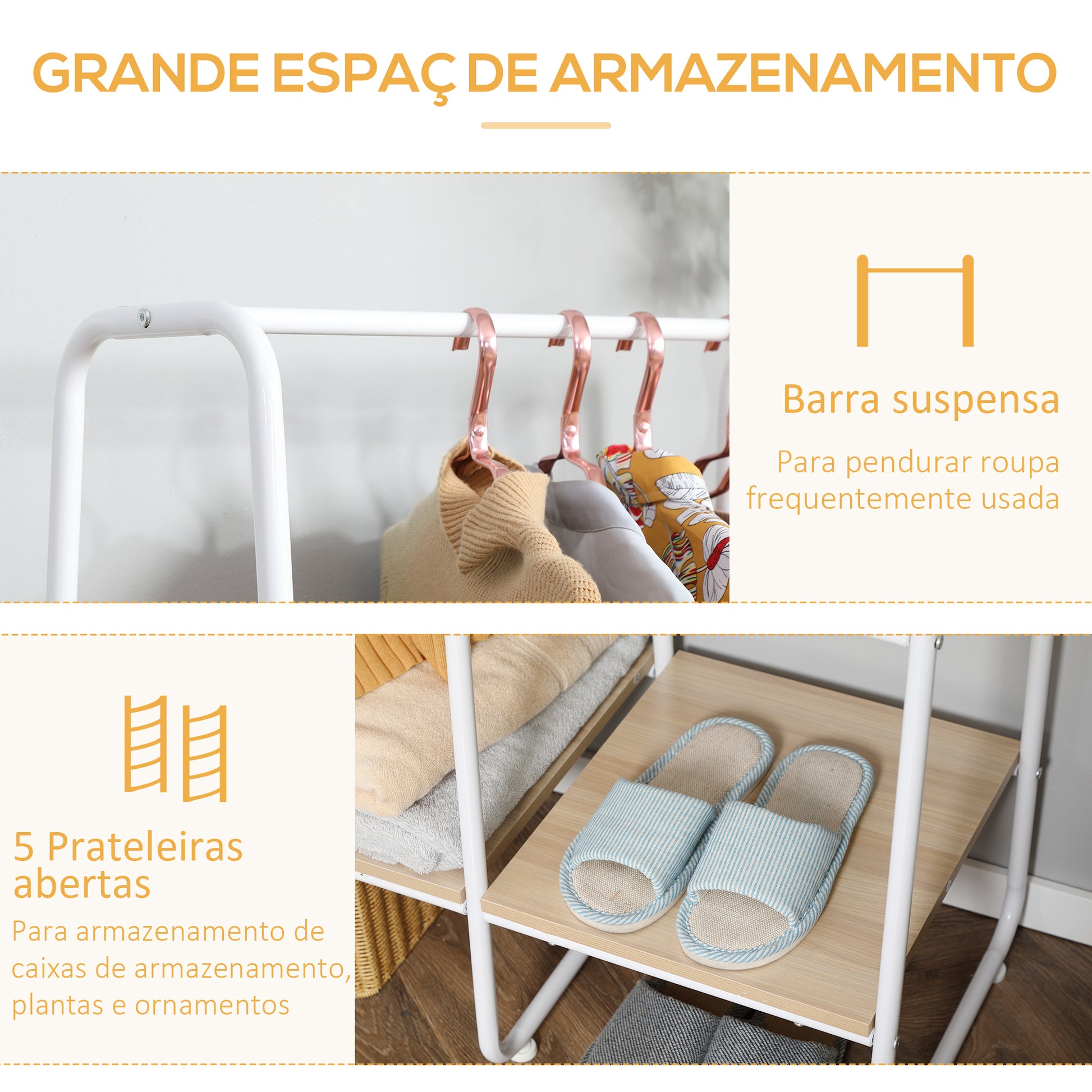 - Especificações: Capacidade máxima de carga de 10 kg (vara de suspensão) e 3 kg (cada prateleira).