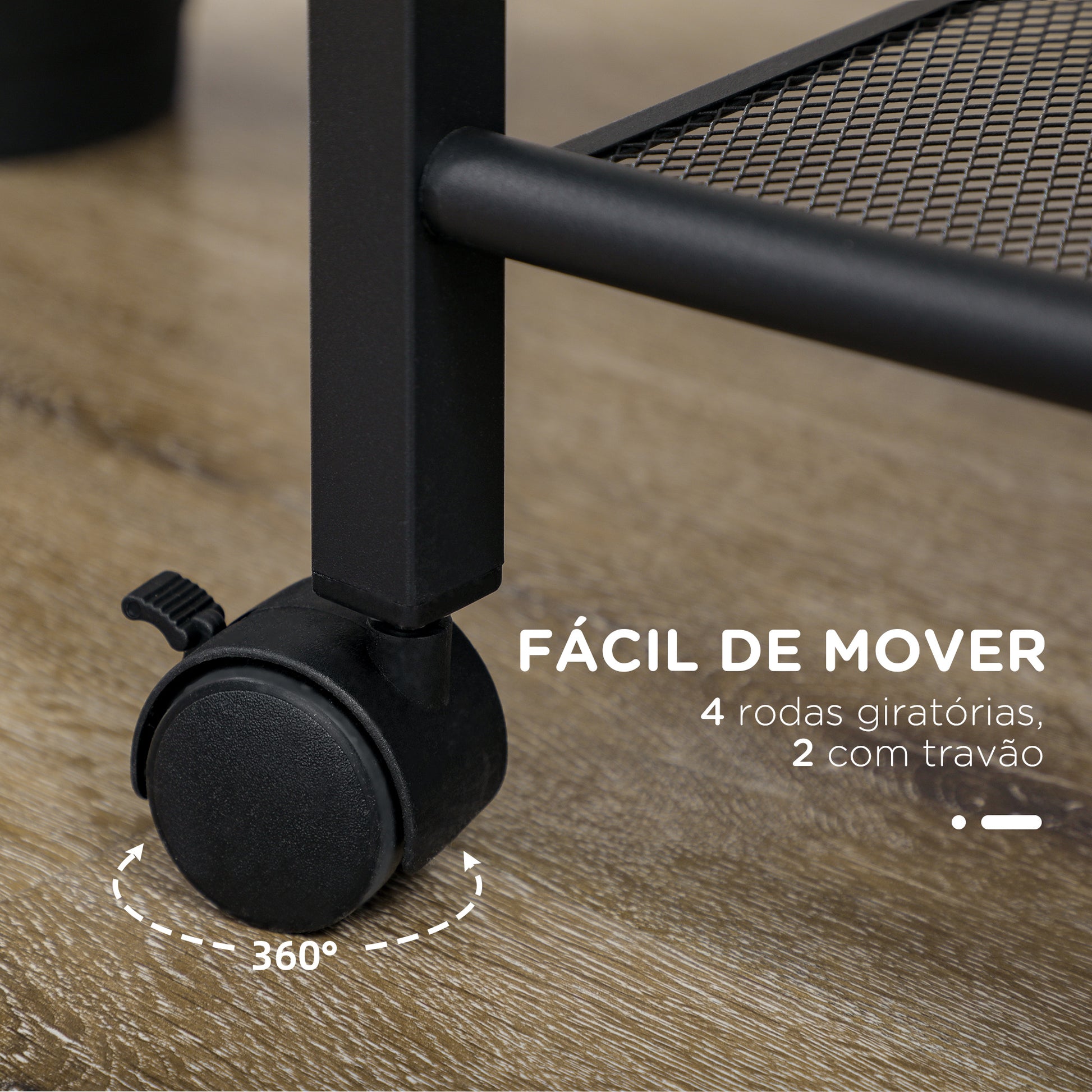 - Benefícios: Design compacto com 3 prateleiras, bolsa de pano lateral, 2 ganchos removíveis e 4 rodas giratórias para fácil movimentação