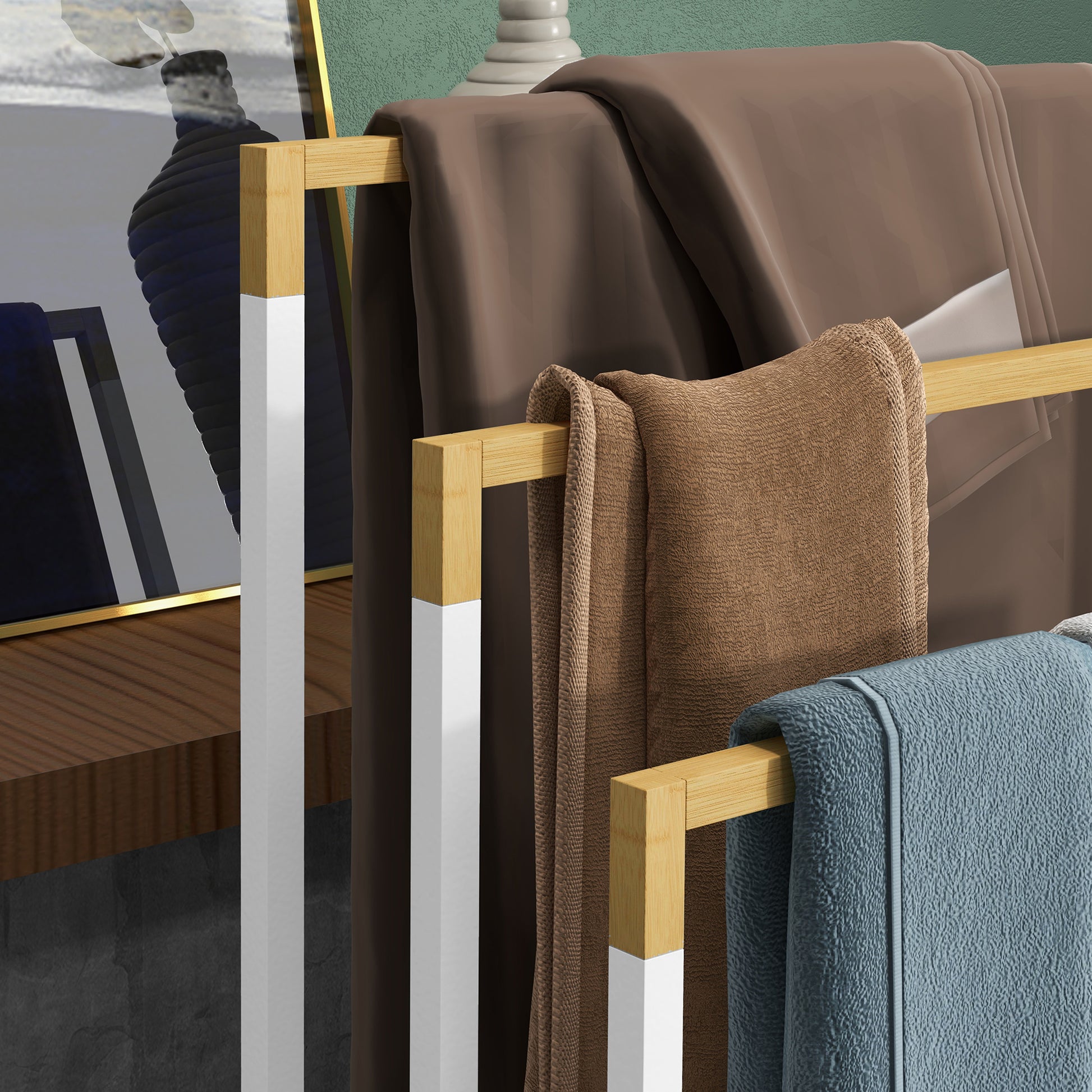 O toalheiro de pé em bambu e aço é uma combinação perfeita entre funcionalidade e estilo, proporcionando um charme natural e elegante ao seu espaço.