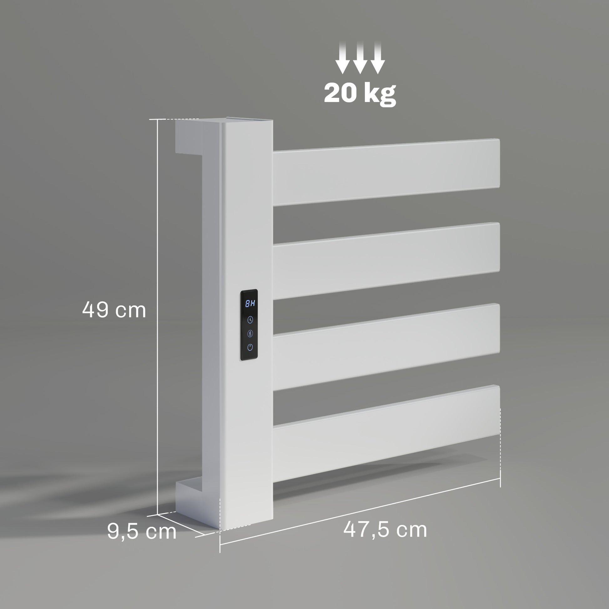 Este toalheiro elétrico de parede em branco é a solução ideal para manter as suas toalhas quentes e secas. Com medidas de 47,5x9,5x49 cm, é feito em liga de alumínio durável e resistente à água, garantindo qualidade e funcionalidade.