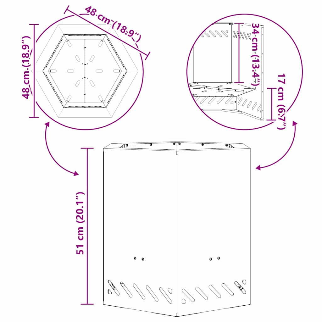 - Forma hexagonal moderna Um toque sofisticado nas fogueiras tradicionais, essa belezura de seis lados é o centro das atenções e começa conversas em qualquer reunião. A geometria maximiza o espaço útil, ficando perfeita em pequenos lugares. O perfil elegante combina com vários estilos, do urbano chic ao rústico, e dá aquele clima legal nas suas confraternizações.