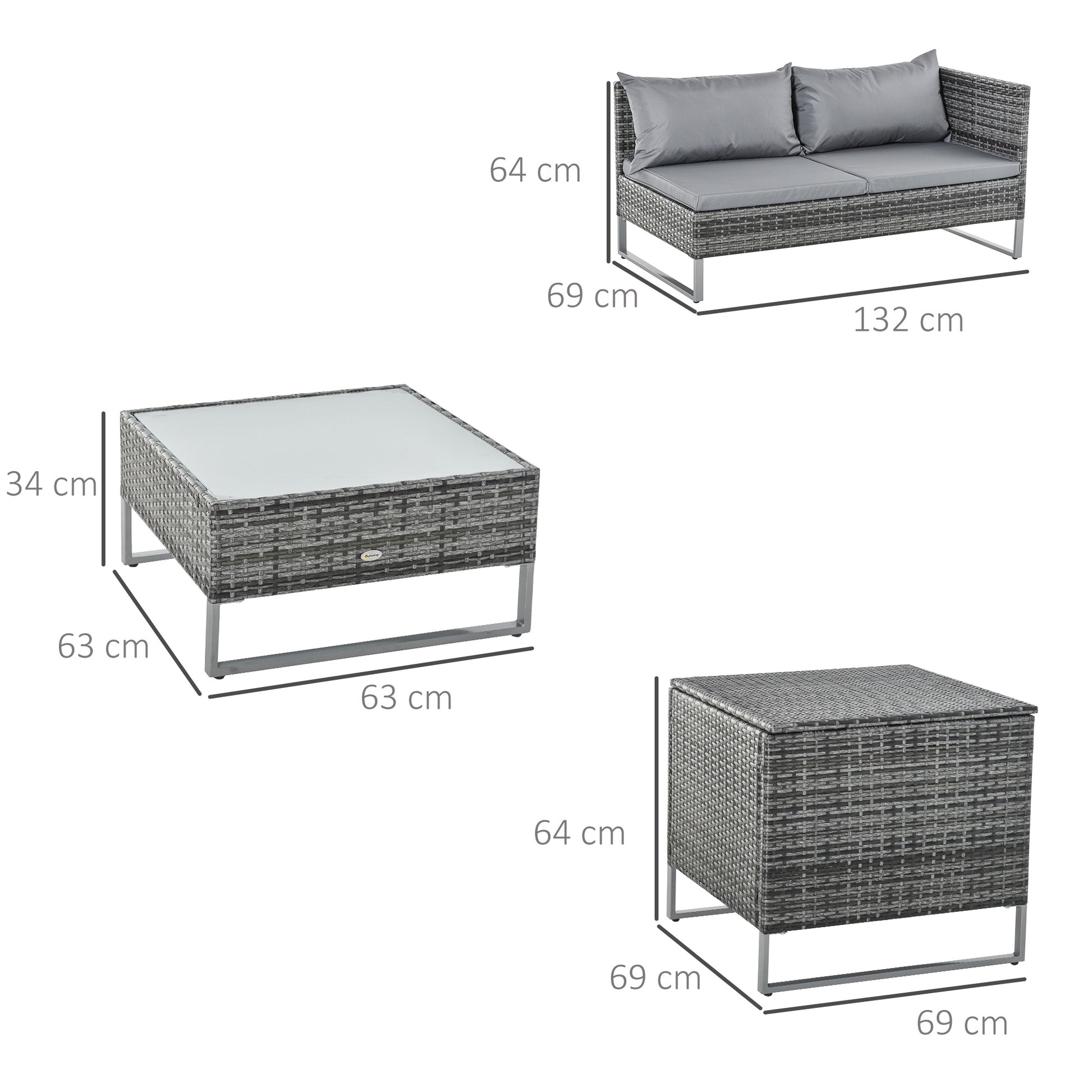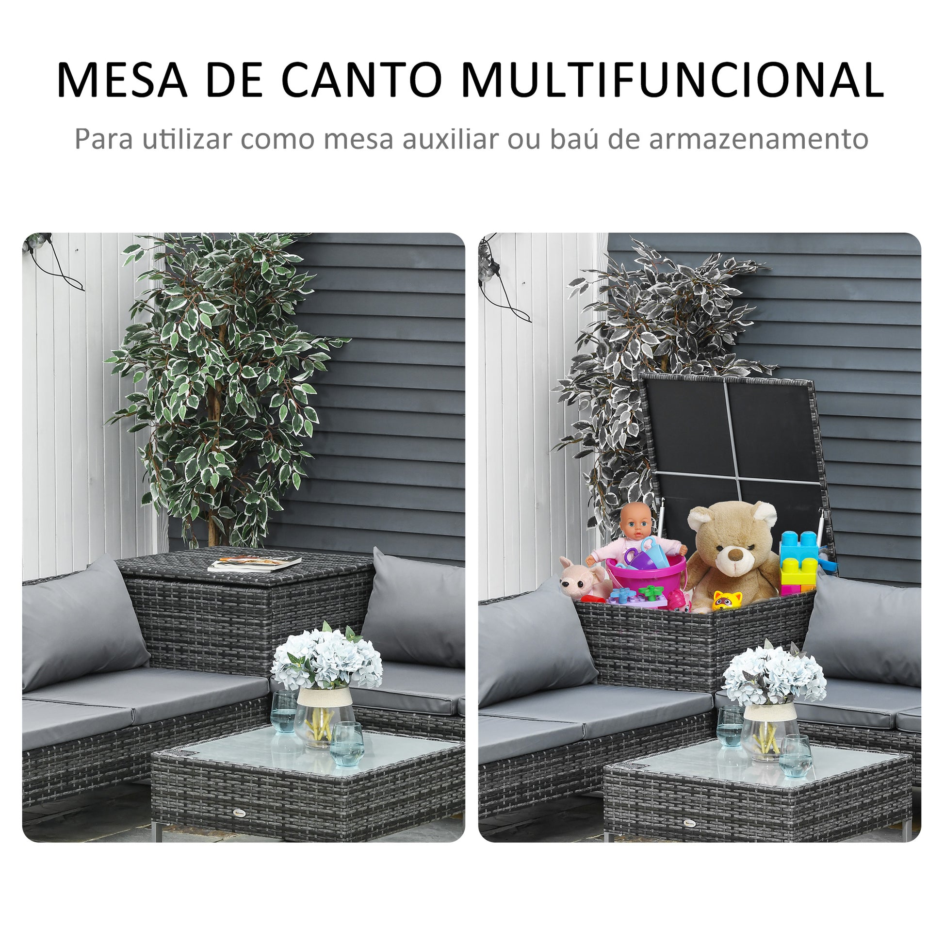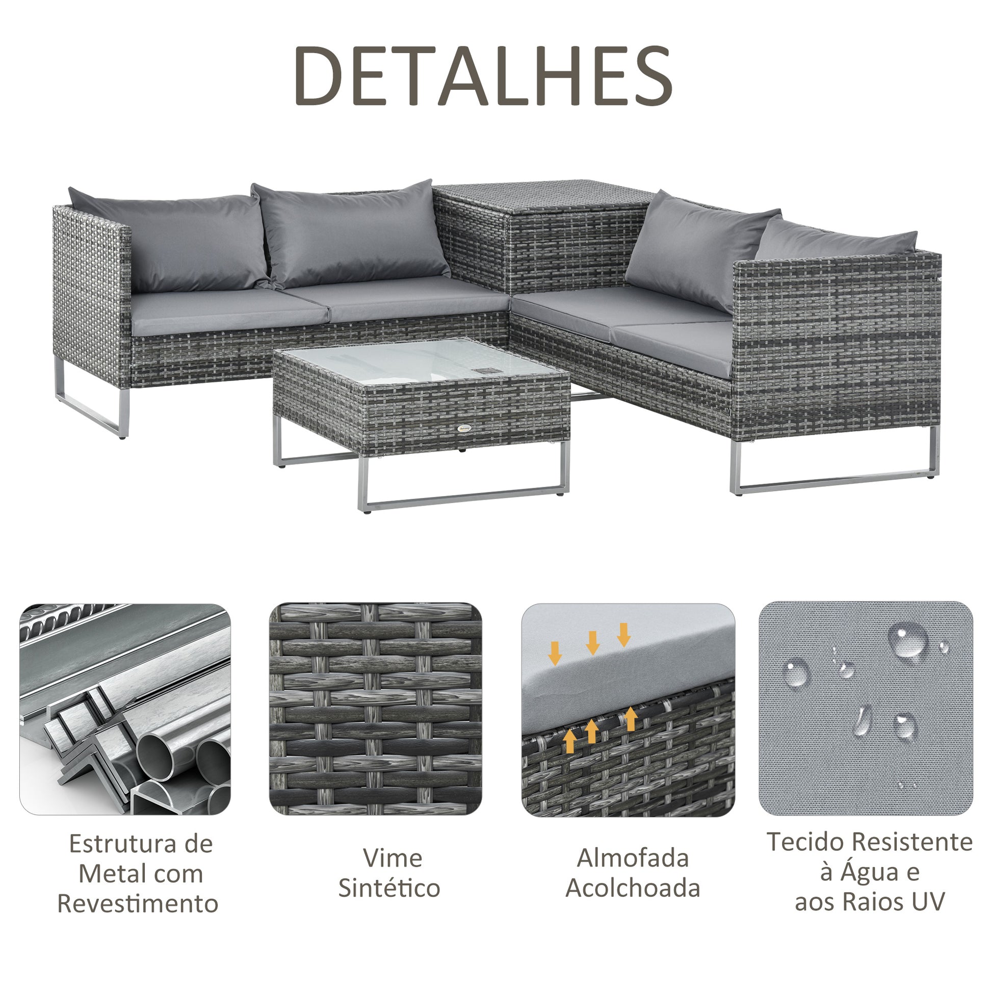Este conjunto de móveis de jardim é composto por 2 sofás duplos, uma mesa de centro e uma mesa alta com baú de armazenamento, oferecendo espaço para 4 pessoas desfrutarem ao ar livre.