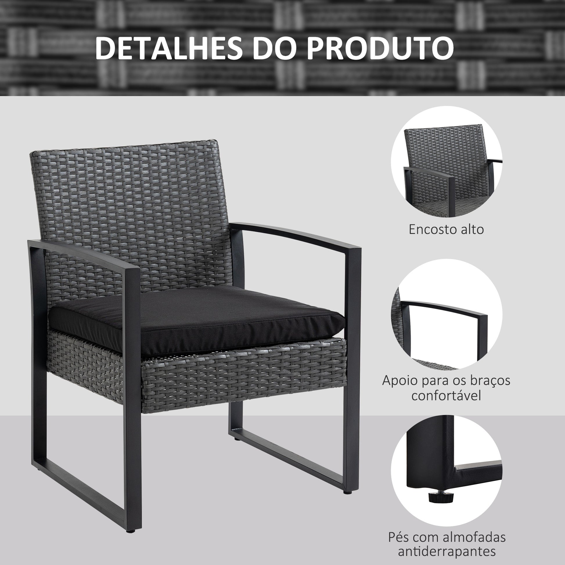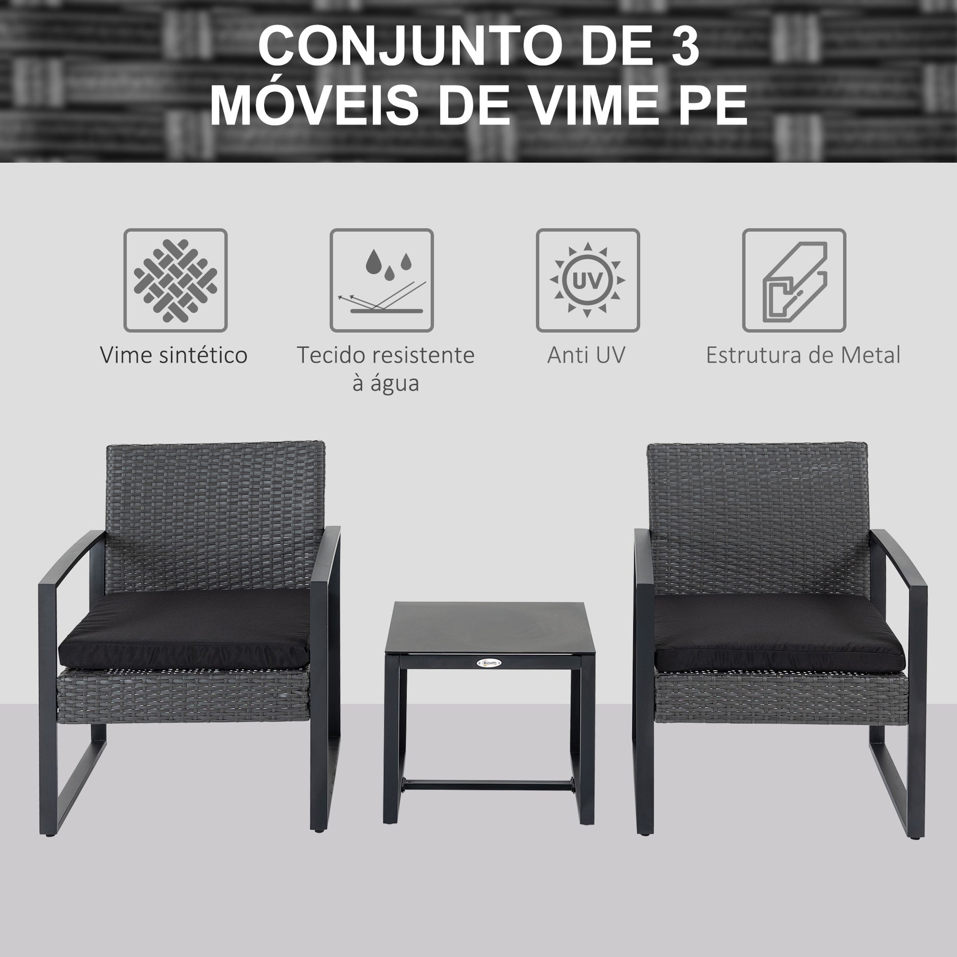Conjunto de Móveis de Jardim de Vime 3 Peças com Mesa 42,5x40x39 cm e 2 Poltronas 63x57x76 cm - Cinzento e Preto