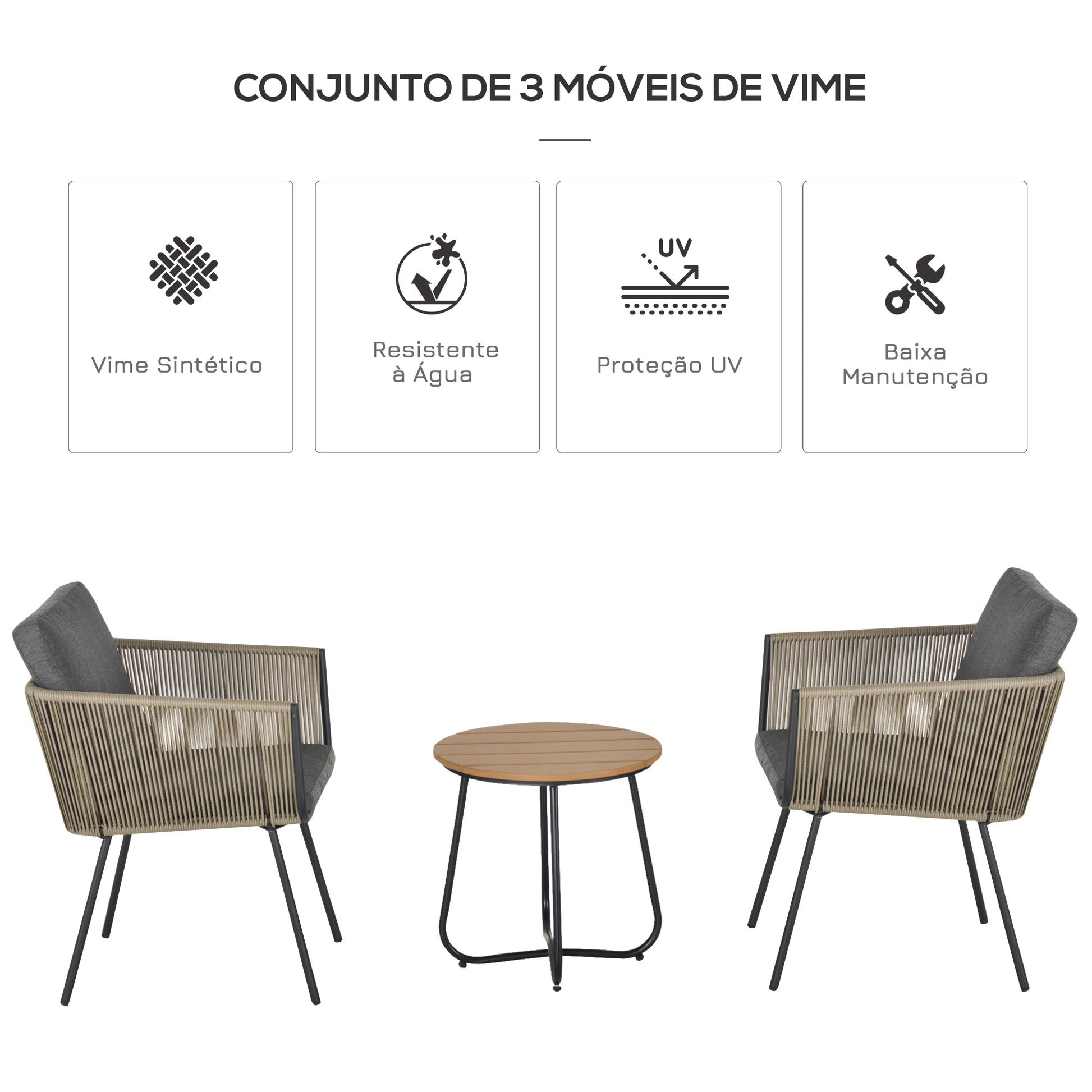 Conjunto de Móveis de Vime para Jardim - Mesa Redonda e 2 Poltronas Cinza e Marrom 60x60x67cm