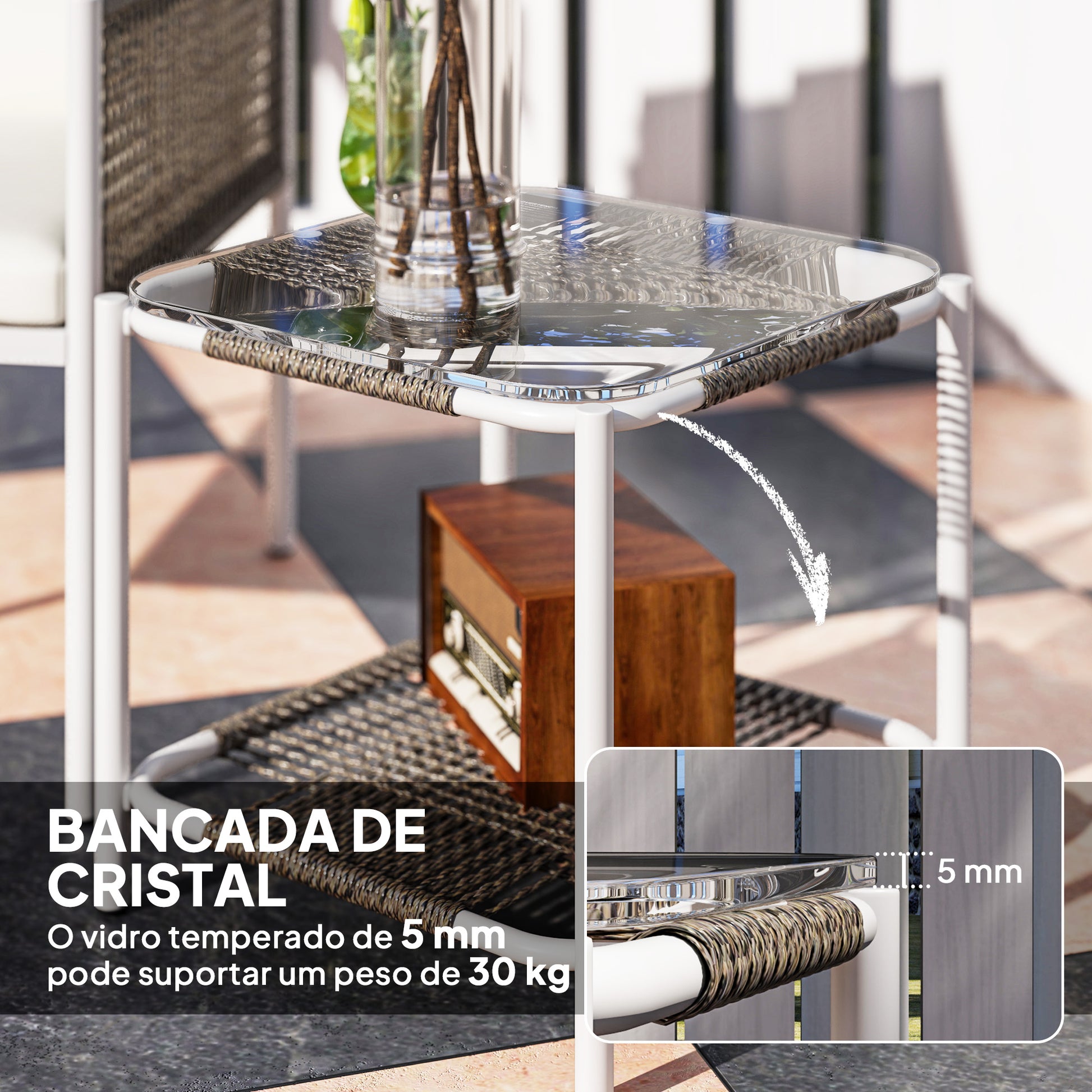 - Materiais: Fabricado em aço resistente, vime PE e poliéster para durabilidade e resistência às intempéries.