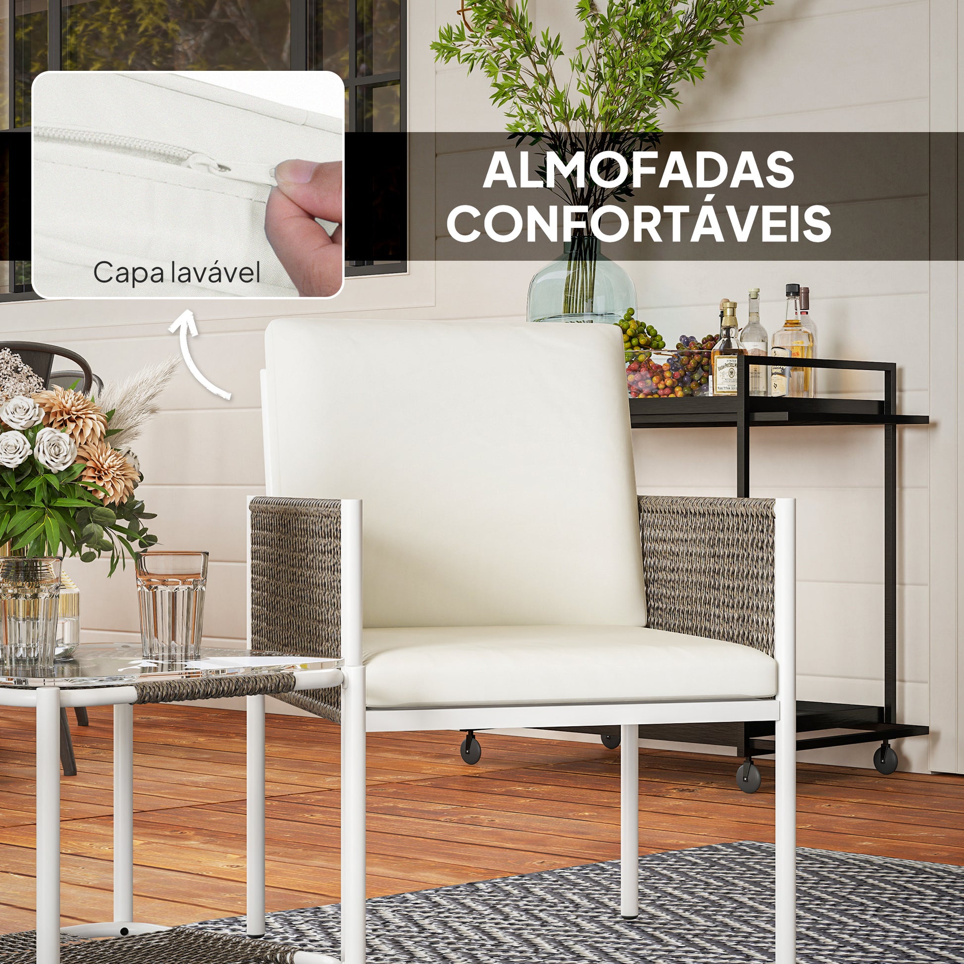 Transforme o seu espaço exterior num refúgio acolhedor com este conjunto de jardim elegante e durável. Ideal para qualquer clima, aproveite o conforto e a elegância que este conjunto proporciona.