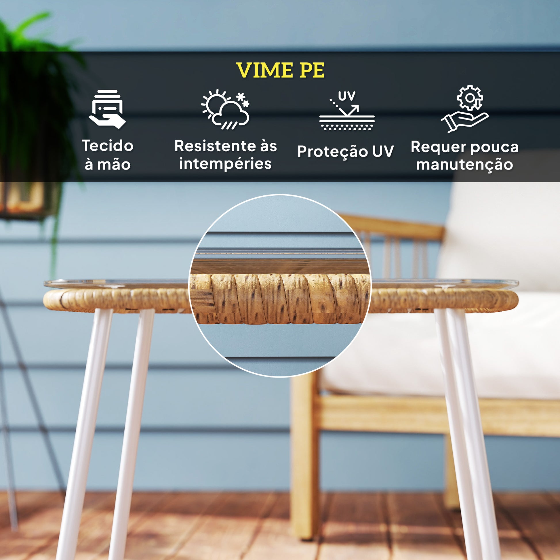 - Materiais: Fabricada com vime sintético resistente ao clima, estrutura em aço com acabamento em pó e bancada de vidro temperado de 5 mm.