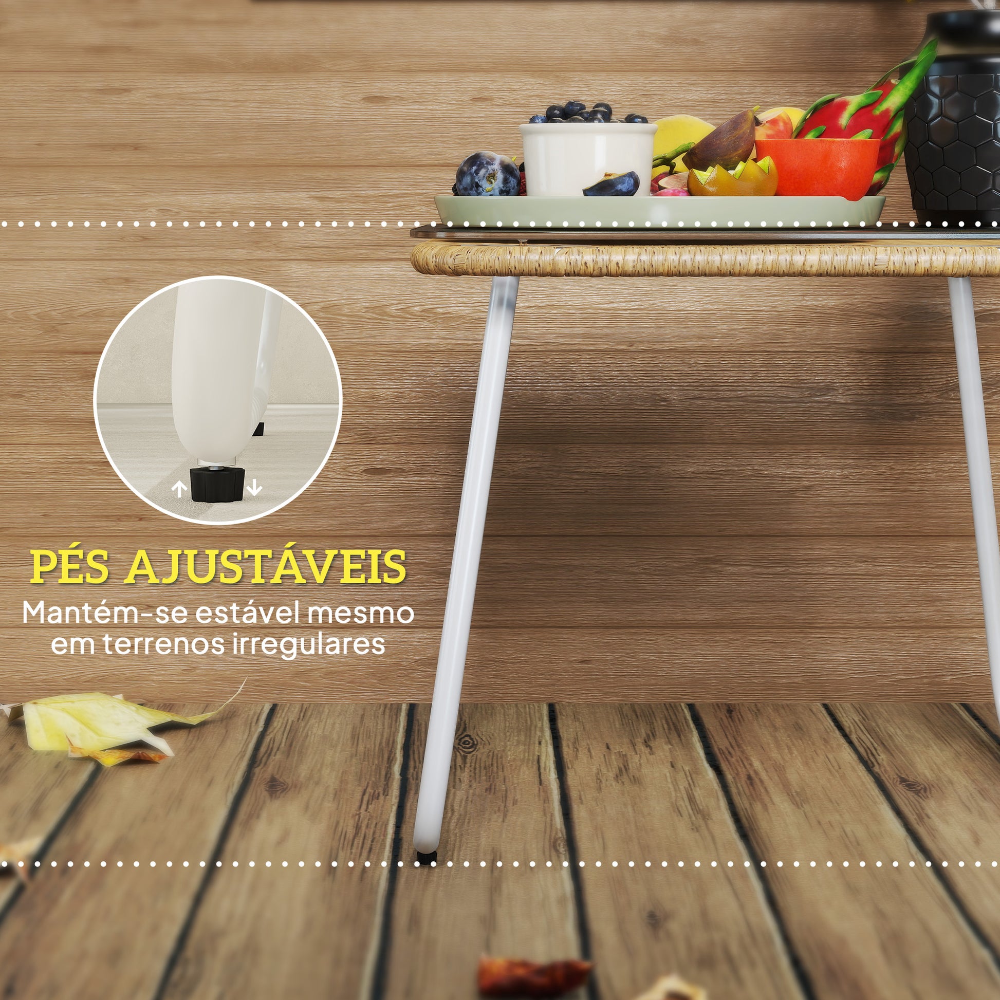 - Benefícios: Pés ajustáveis para estabilidade em terrenos irregulares, resistente aos raios UV e fácil de limpar.