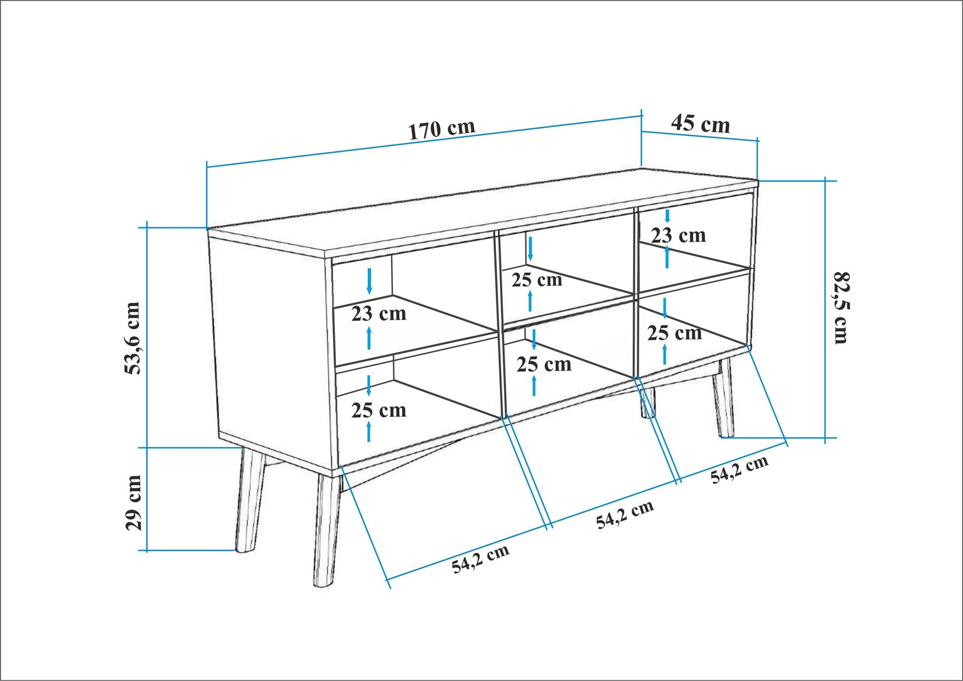Com uma largura de 170 cm, uma altura de 82. 5 cm e uma profundidade de 45 cm, esta consola oferece muito espaço de arrumação para todos os seus objectos essenciais. A altura das pernas de 29 cm dá-lhe um aspeto flutuante, acrescentando um toque de modernidade ao seu espaço.