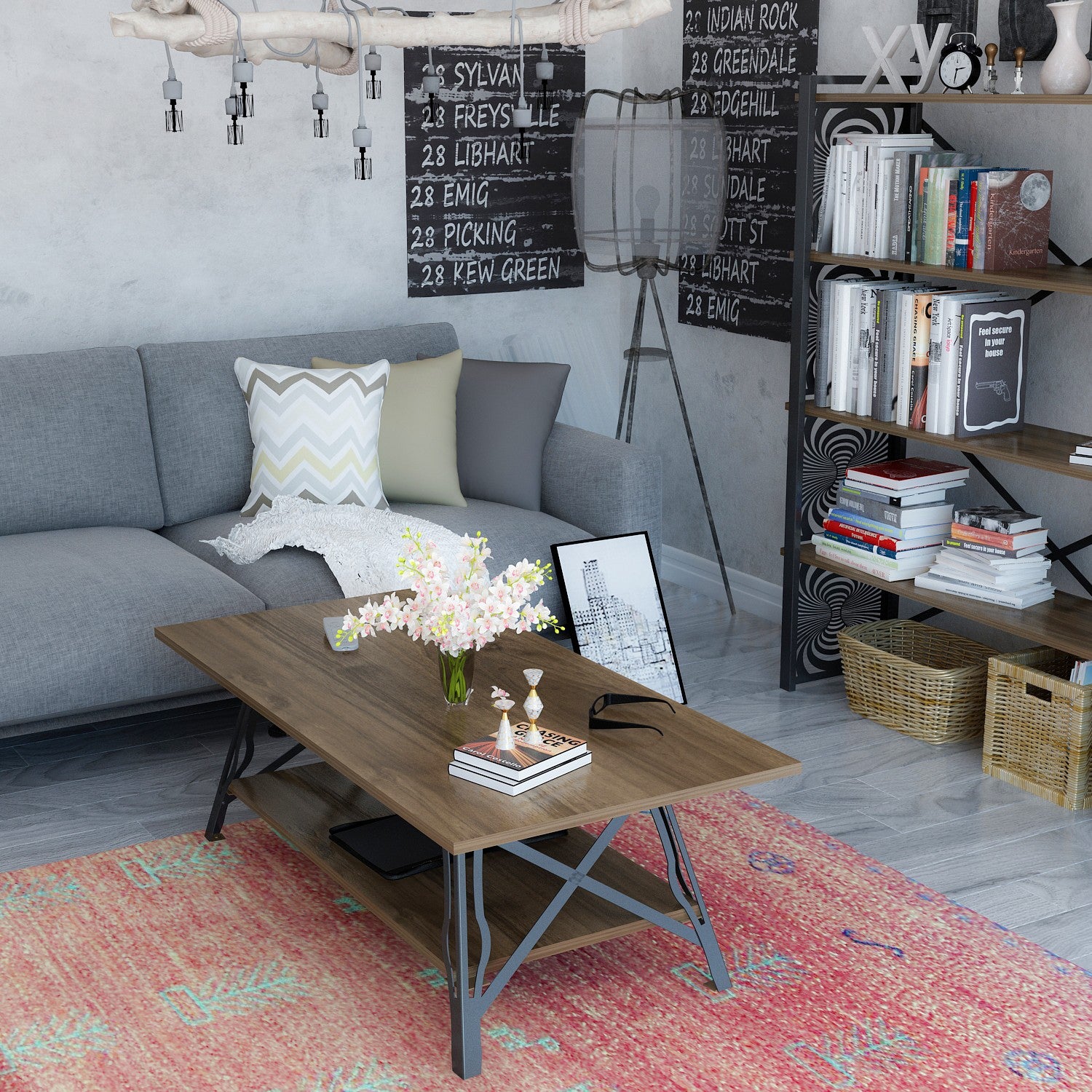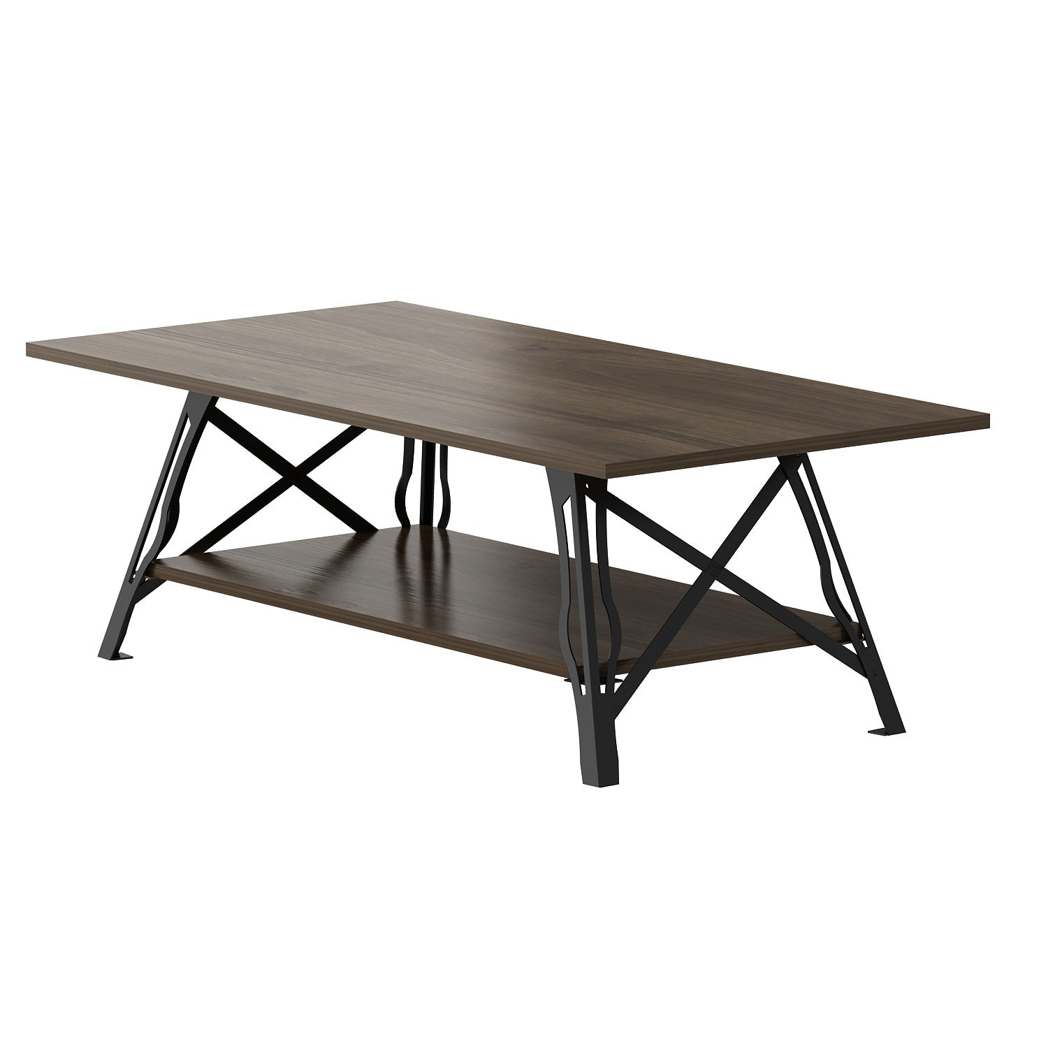 Mesa de Centro Moderna com 2 Prateleiras - Nogueira e Preto com Estrutura Metálica e Arrumação Extra