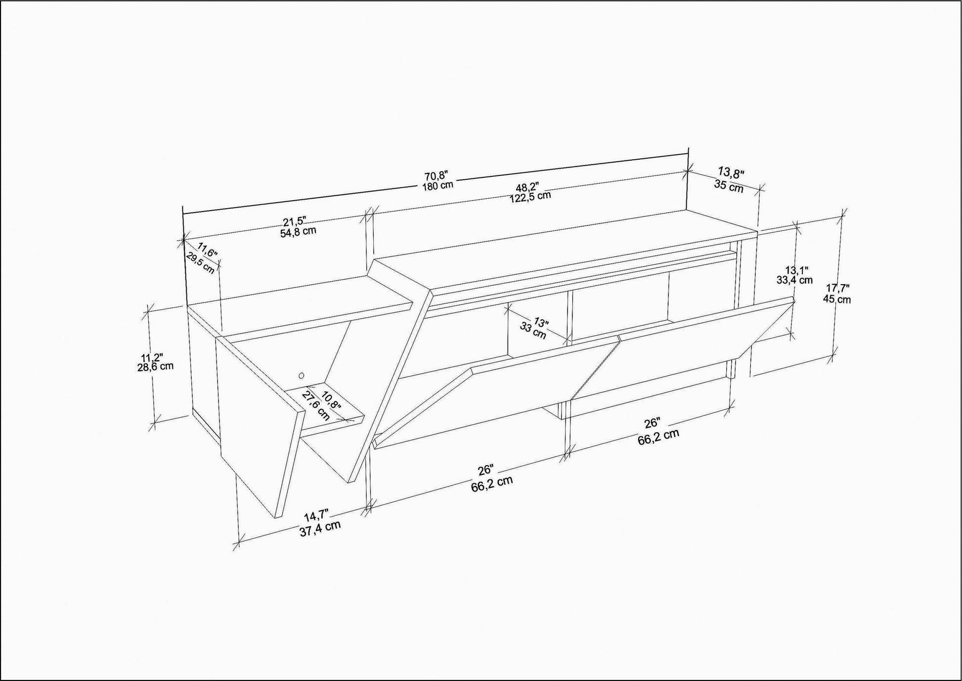As linhas limpas e o design contemporâneo deste suporte para TV o tornam uma adição versátil a qualquer estilo de decoração de casa. Se você prefere um visual minimalista ou uma vibe mais eclética, este suporte se integrará perfeitamente aos seus móveis e decoração existentes. A largura de 180 cm, altura de 28,6 cm e profundidade de 35 cm oferecem bastante espaço para sua TV, consoles de jogos, DVDs e muito mais.