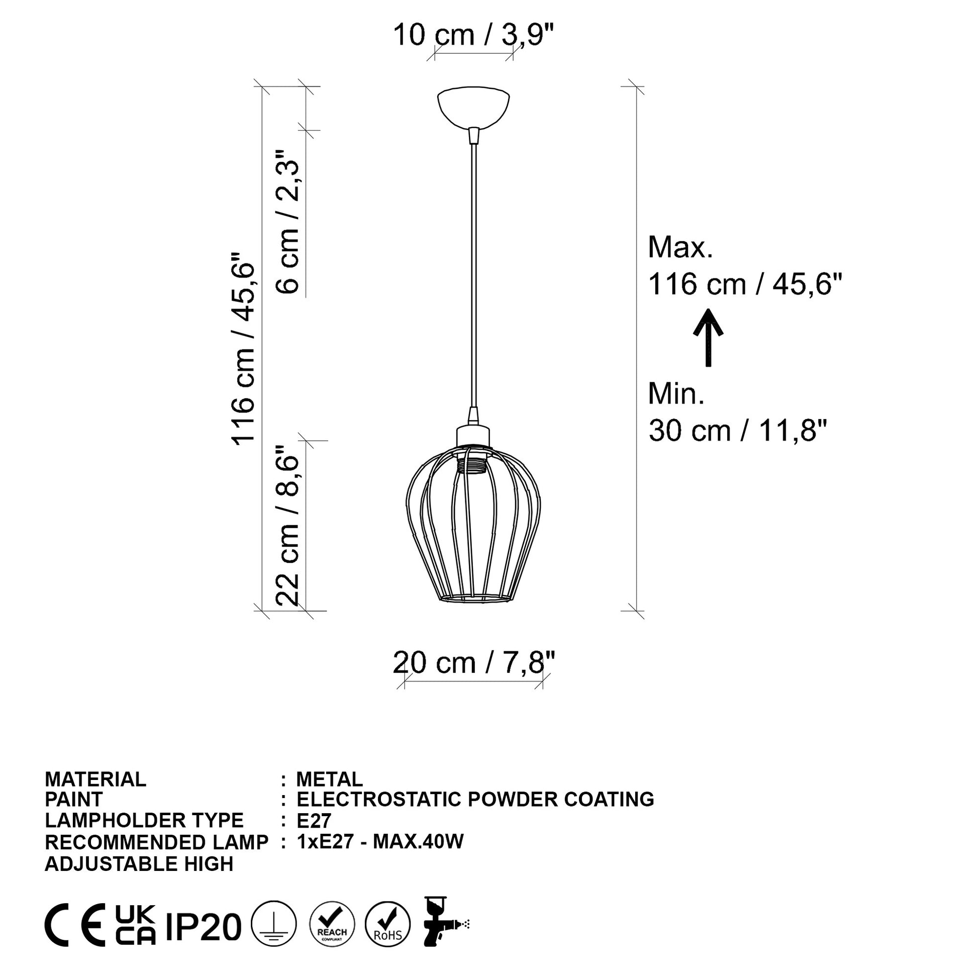 - Tipo de tomada: 1 x E 27 Max 40 W