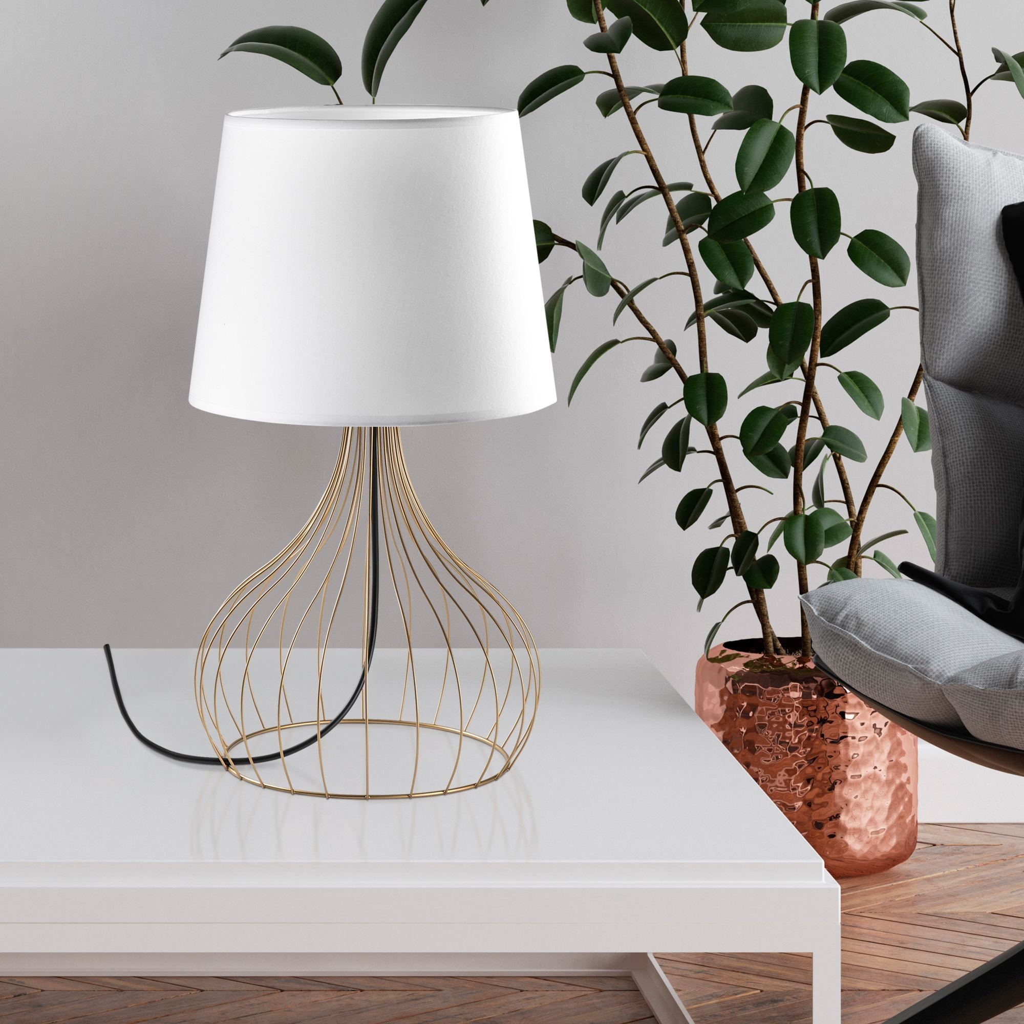 Ilumine seu espaço com elegância e estilo com nossa deslumbrante Lâmpada de Mesa com Corpo de Metal. O corpo de metal elegante combinado com uma cúpula de tecido suave cria um belo contraste que instantaneamente elevará qualquer ambiente em sua casa.