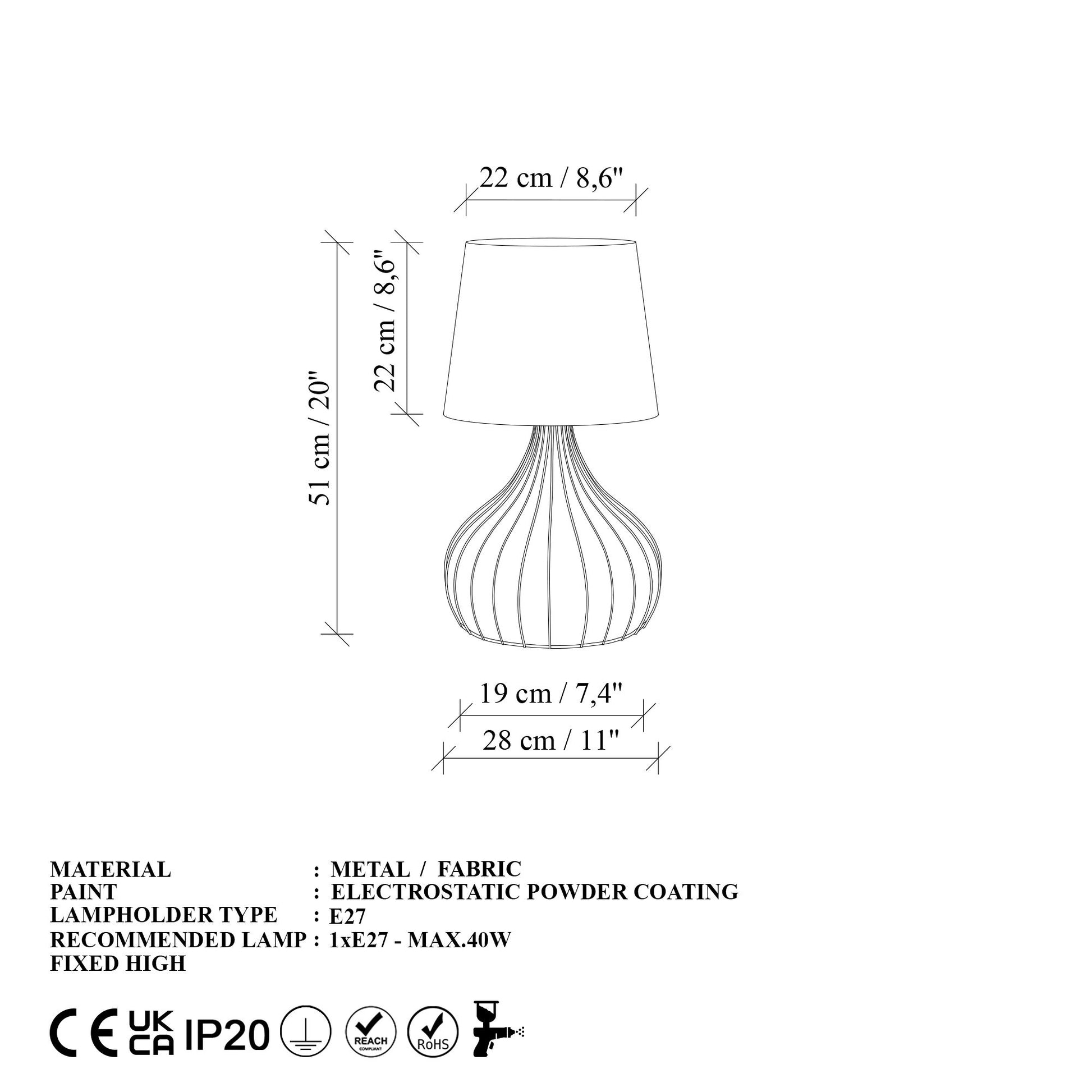 Com um tamanho de 28 x 28 x 51 cm, esta lâmpada de mesa é o tamanho perfeito para fazer uma declaração sem sobrecarregar seu espaço. O brilho suave emitido pelo soquete 1 x E 27 Max 40 W criará uma atmosfera quente e convidativa, perfeita para relaxar após um longo dia.