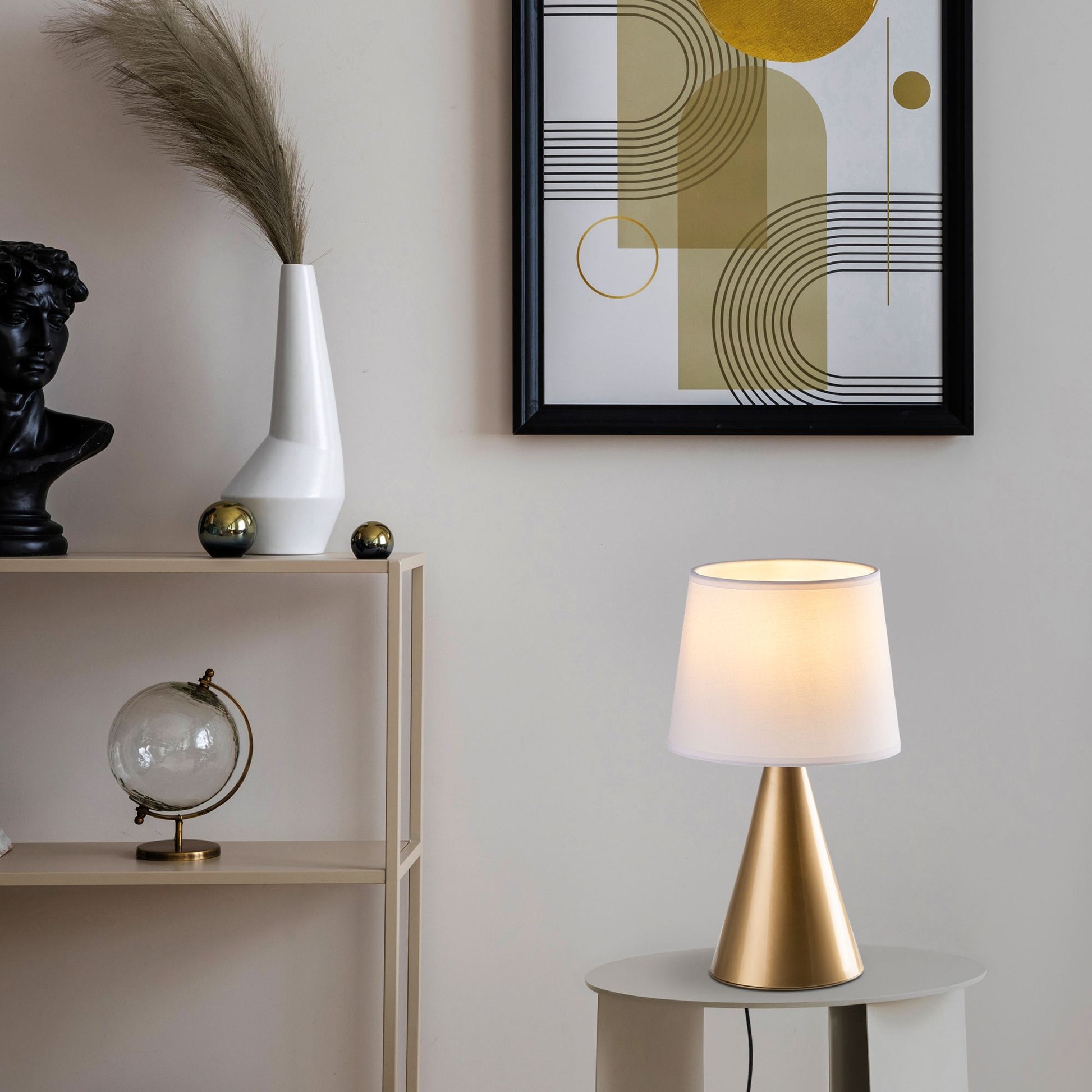 Com seu design moderno e materiais de alta qualidade, esta lâmpada de mesa não é apenas uma fonte de luz, mas uma peça de arte que irá realçar a estética do seu espaço. O tamanho da cúpula Ø22-28 h:22 cm é perfeito para qualquer mesa ou criado-mudo, adicionando um toque de sofisticação à sua decoração.