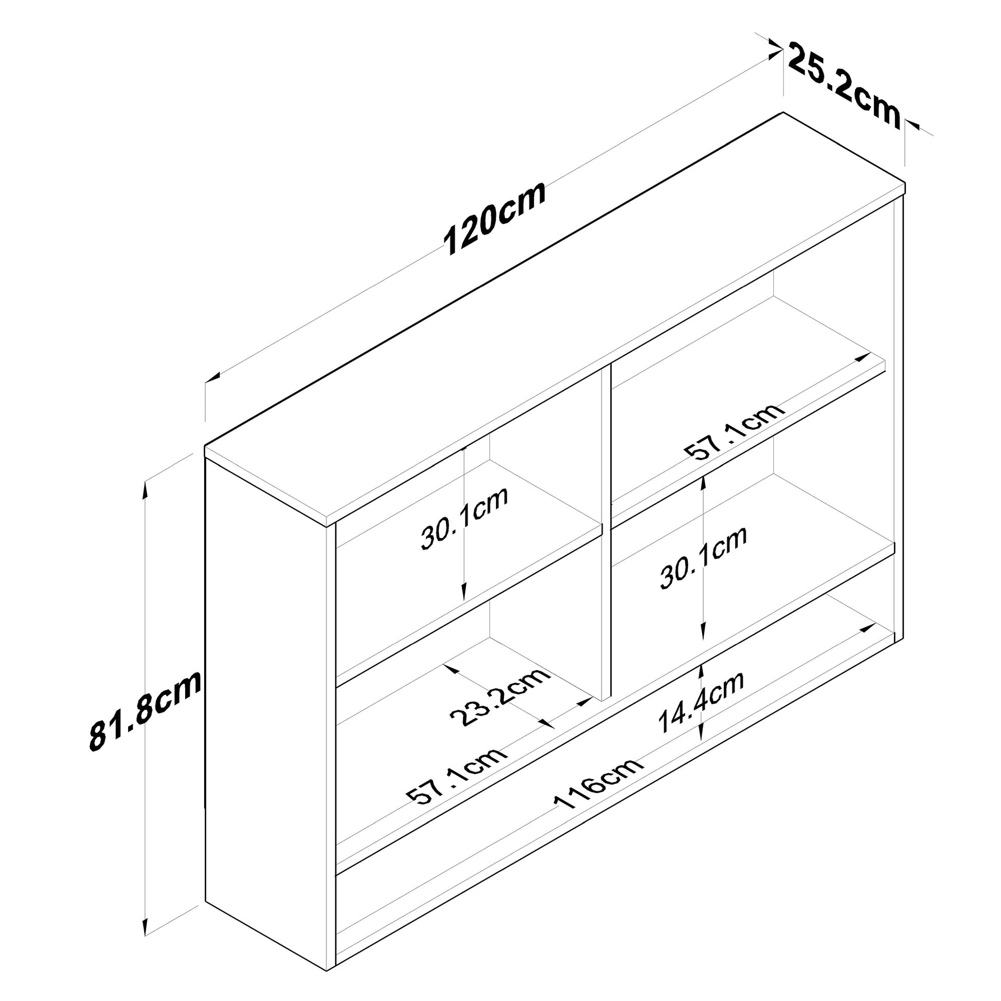 Com uma largura de 120 cm, altura de 61,8 cm e profundidade de 27,5 cm, este armário oferece amplo espaço de armazenamento para todos os seus itens essenciais. Os suportes para canecas proporcionam um local conveniente para suas canecas, enquanto as numerosas prateleiras permitem que você exiba suas peças de decoração favoritas. O armazenamento adicional garante que tudo tenha seu lugar, mantendo seu espaço livre de bagunça.