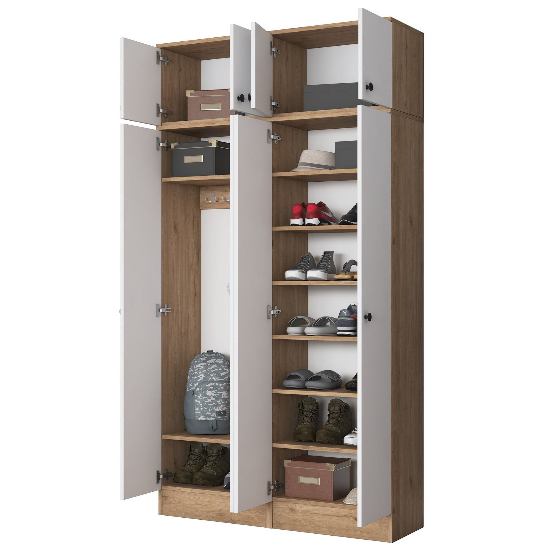 Medindo 119,6 cm de largura, 226,4 cm de altura e 37,5 cm de profundidade, este cabideiro é compacto, mas espaçoso. Ele também pode ser fixado na parede para maior estabilidade, tornando-se uma solução prática e que economiza espaço para o seu corredor.